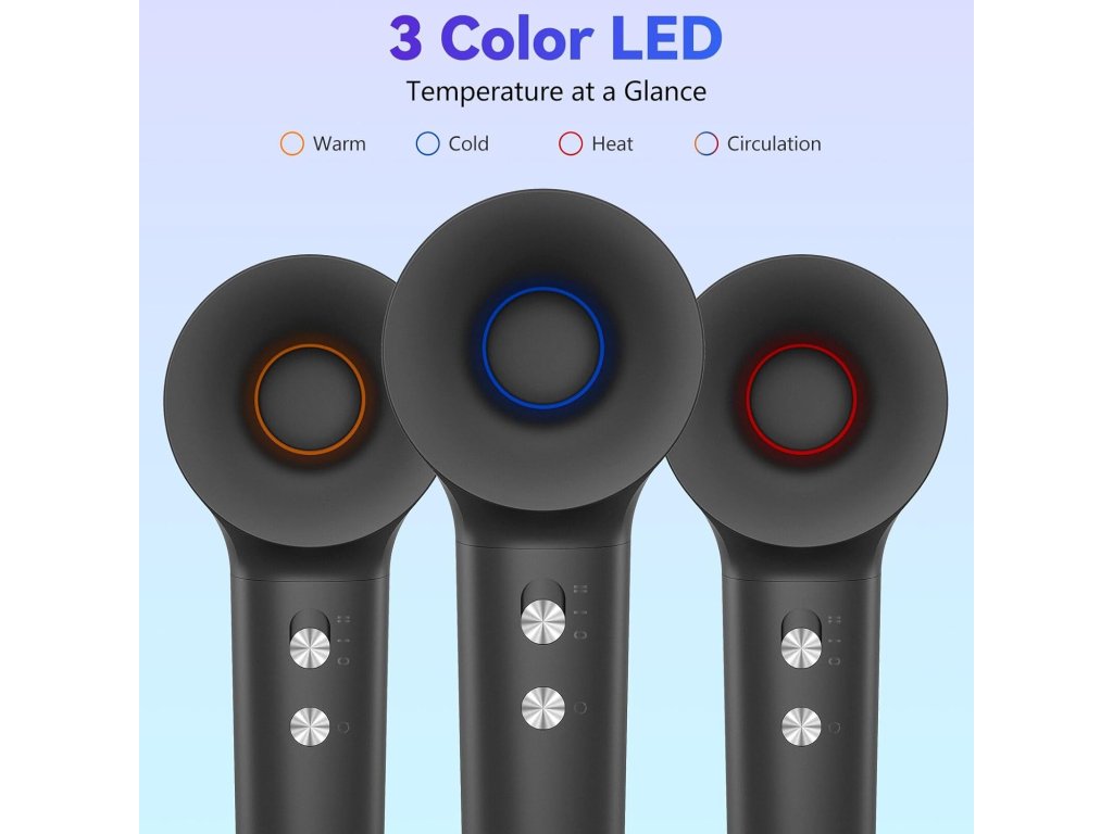 Fén TQQ s difuzérem je vybaven vysokorychlostním bezkartáčovým motorem s 110 000 otáčkami za minutu, který dosahuje rychlosti větru 22 m/s a vysuší vaše vlasy až pětkrát rychleji než běžné fény, obvykle do 2 minut. Inteligentní termoregulační systém udržuje stálou teplotu 52 °C střídáním teplého a studeného vzduchu, monitoruje teplotu 100krát za sekundu a provádí drobné úpravy, aby zabránil poškození vlasů a pokožky hlavy extrémním teplem. Generátor 200 milionů negativních iontů uzavírá vlasovou kutikulu, zadržuje vlhkost, zanechává vlasy hedvábně hladké, bez krepatění a s přirozeným leskem. Tento cestovní fén váží pouhých 395 g, je kompaktní, ergonomicky navržený a ideální pro ženy i muže. Díky 6vrstvé technologii tlumení hluku, zvukově izolačnímu vstupu vzduchu a německé zvukově absorpční vrstvě PI dosahuje velmi nízké hlučnosti (57 dB), takže sušení vlasů pozdě v noci neruší spánek vaší rodiny. Součástí balení je 360° otočný magnetický difuzér pro definování vln a loken a koncentrátor pro precizní styling. Chytrý 3barevný LED kruhový indikátor zobrazuje aktuální teplotu: červená (78 °C - horký vzduch), žlutá (49 °C - teplý vzduch), modrá (studený vzduch). Dlouhým stisknutím tlačítka aktivujete inteligentní recirkulační režim, který střídá teplý a studený vzduch, čímž chrání vlasy před přehřátím.