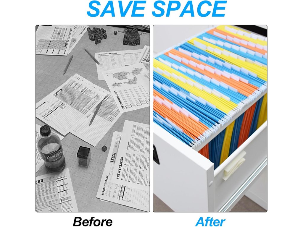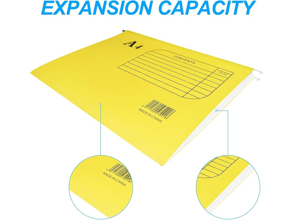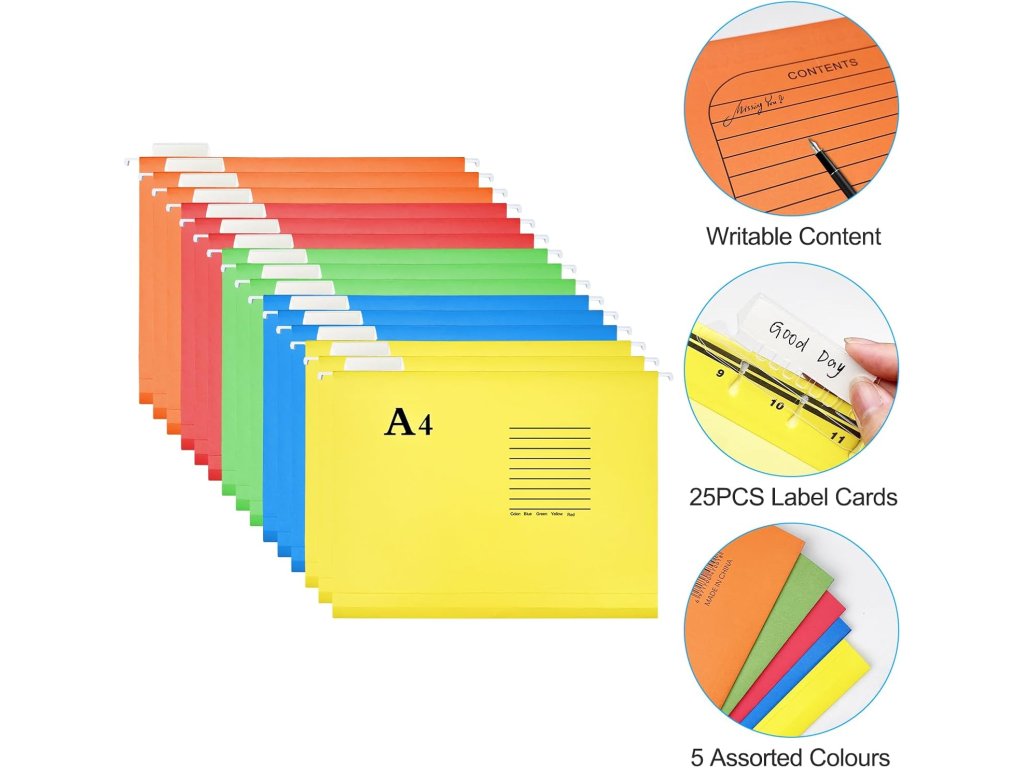 Tyto barevné závěsné složky jsou ideální pro organizaci dokumentů ve formátu A4 v kanceláři, škole nebo doma. Sada obsahuje 15 složek v barvách červené, žluté, modré, zelené a oranžové (3 kusy od každé barvy). Jsou vyrobeny z kvalitního kartonu, na který lze psát, a jsou dodávány s bílými štítky a průhlednými držáky pro snadné třídění. Složky mají rozměry 31,5 x 24 cm a jejich dno lze rozšířit až na 5 cm.