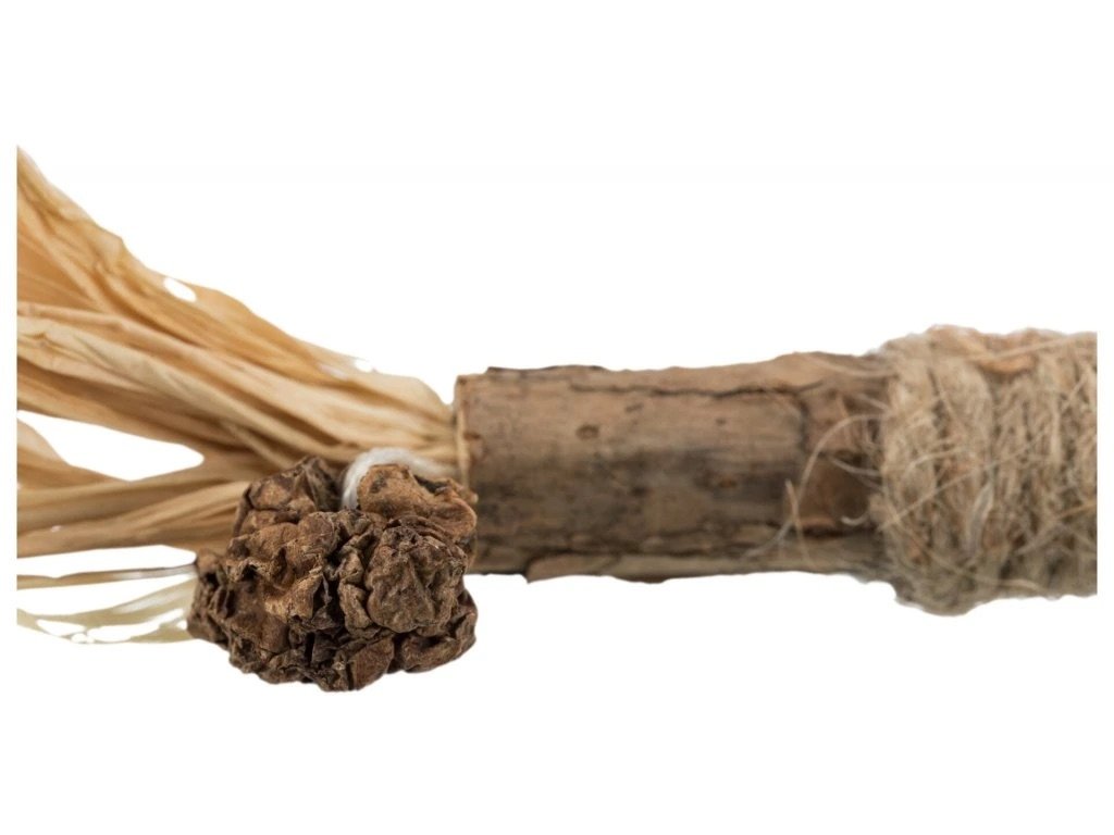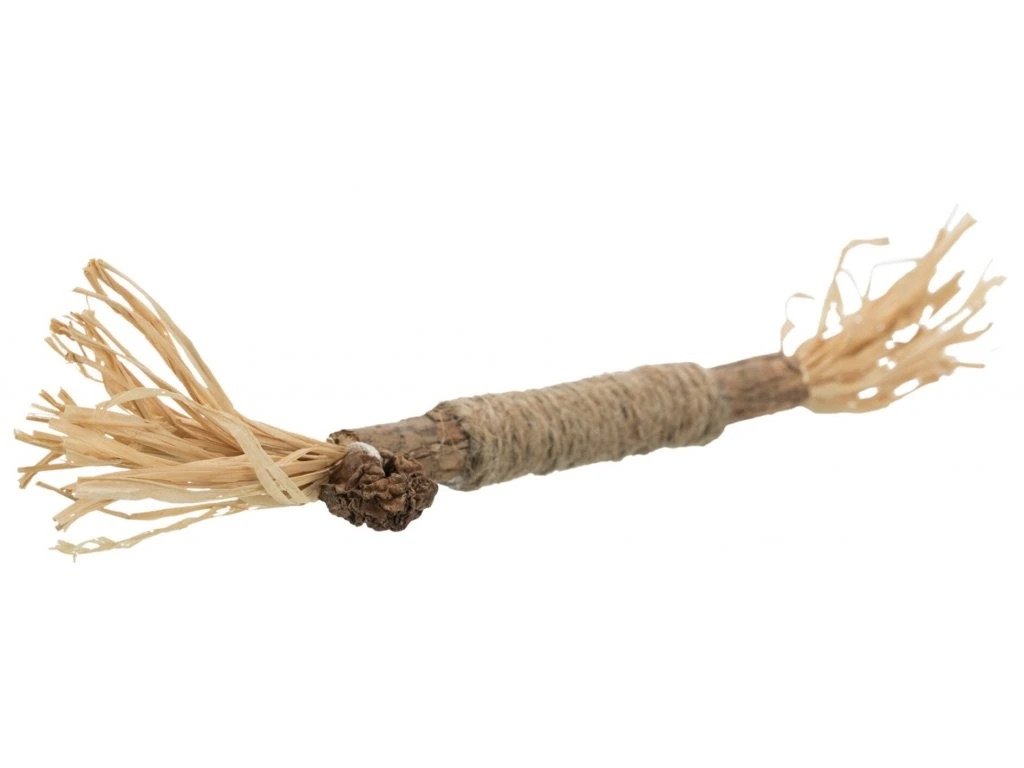Tato interaktivní hračka pro kočky od značky Trixie kombinuje přirozenou přitažlivost Matatabi (šanty kočičí) s dalšími lákavými prvky. Dlouhá tyčinka z Matatabi je omotaná jutovým provázkem pro lepší úchop a na obou koncích má připevněné lýkové střapce, které kočky lákají ke hře.Největším lákadlem je však zavěšený plod Aktinidie (Actinidia polygama), který je pro mnoho koček ještě neodolatelnější než samotná Matatabi. Kočky Matatabi milují – mazlí se s ní, olizují ji a okusují, čímž si přirozeně čistí zuby a zlepšují dentální hygienu. Účinky Matatabi jsou podobné šantě kočičí nebo kozlíku lékařskému, ale má unikátní vůni, která oslovuje i kočky, které na šantu nereagují.Tato tyčinka s plodem a třásněmi poskytne vaší kočce dlouhé hodiny zábavy a zároveň přispívá k jejímu zdraví.