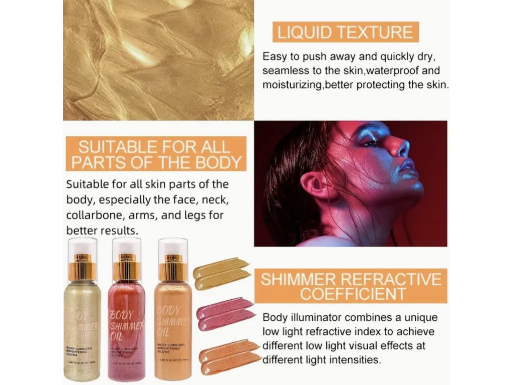 S objemem 100 ml (3,4 Fl.Oz) je tento produkt praktický na cesty i pro každodenní použití. Naneste jej na klíčová místa, jako jsou ramena, dekolt, lícní kosti nebo nohy, a užijte si jemný třpyt, který zvýrazní vaši krásu.