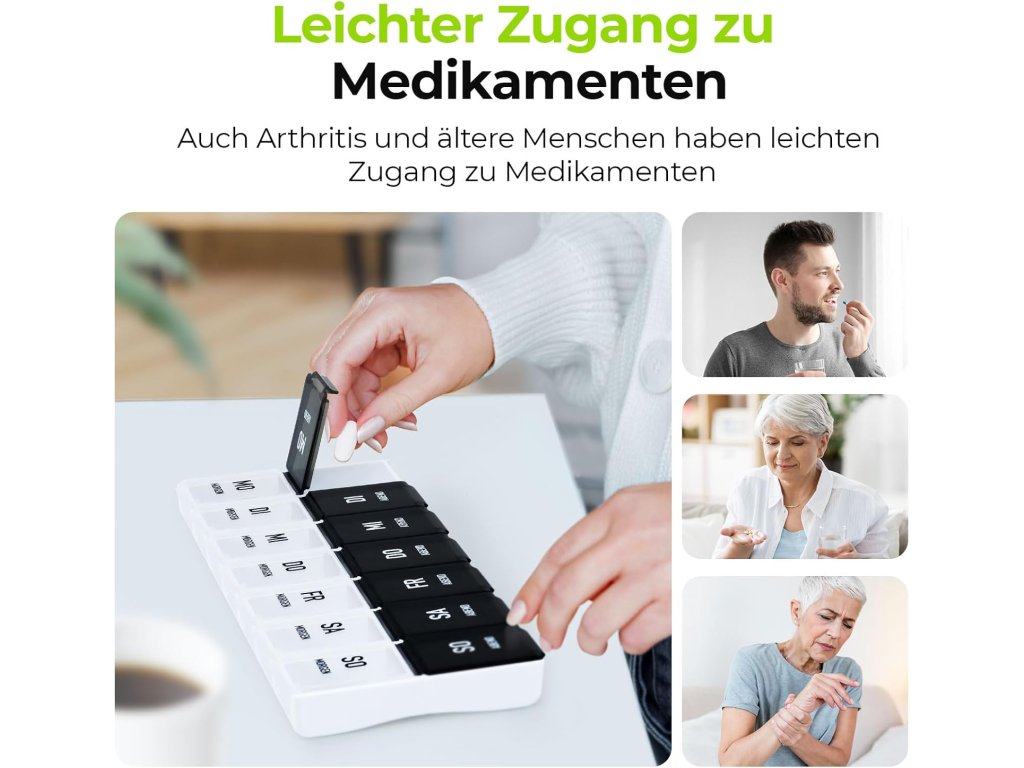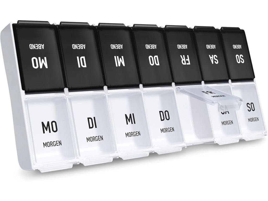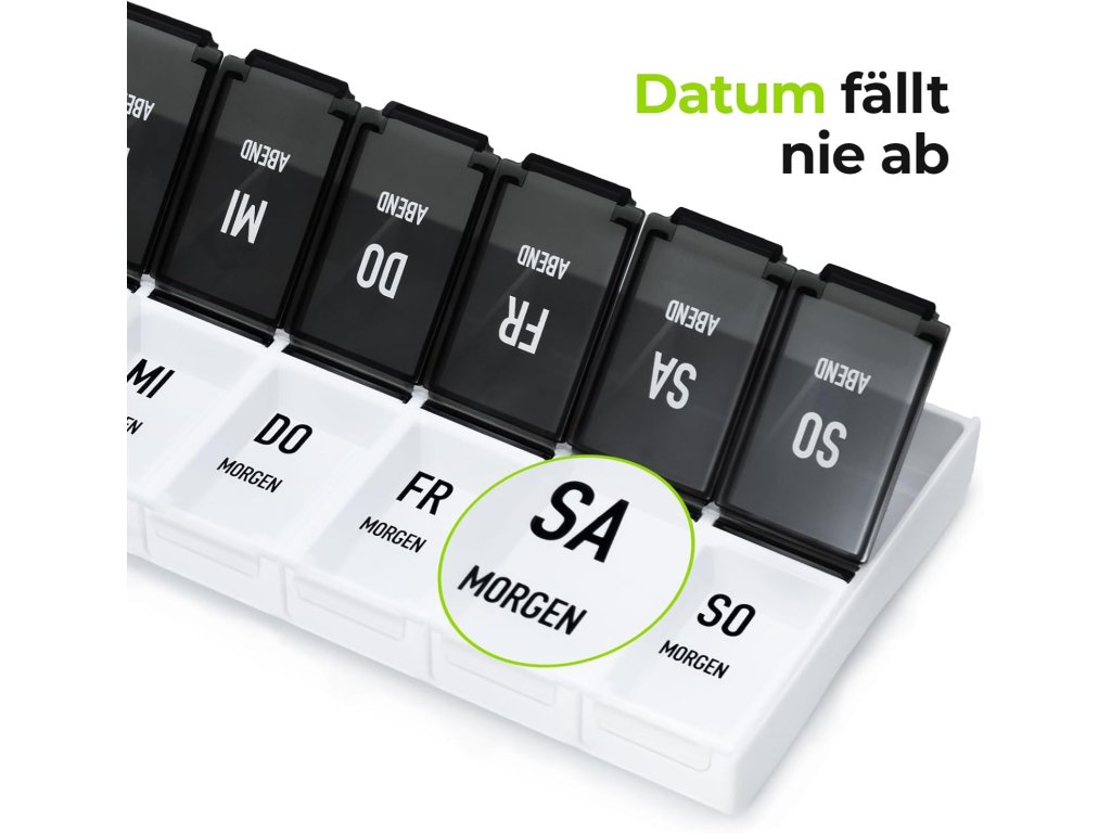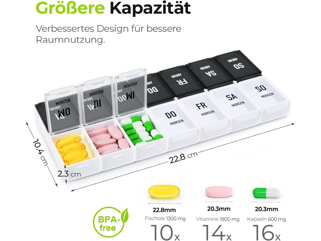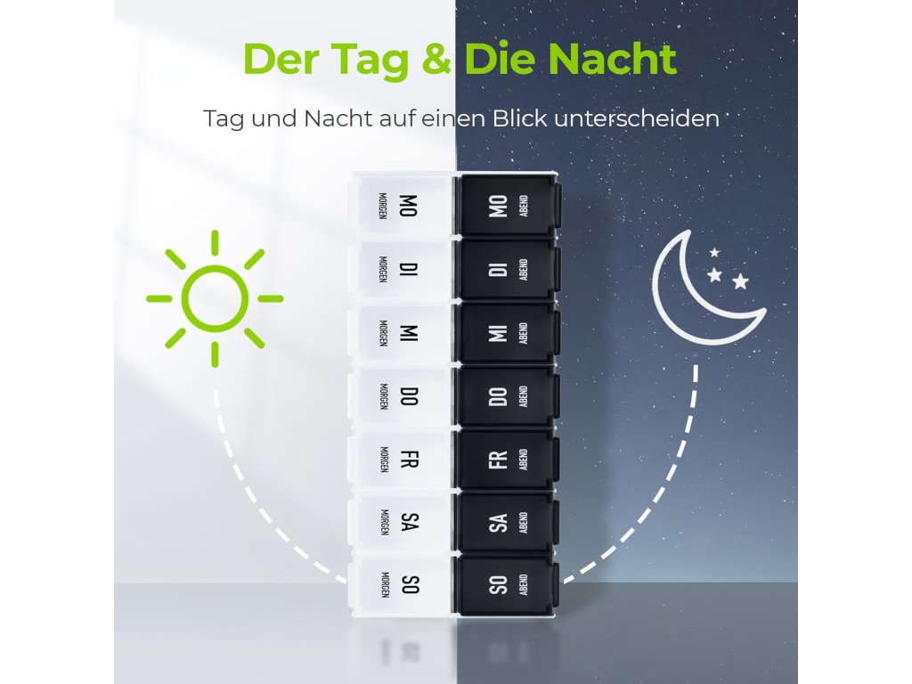 Dávkovač je navržen s extra velkými přihrádkami, do kterých se vejde například až 10 tobolek rybího oleje. To vám umožní připravit si týdenní dávky dopředu a mít tak jistotu, že jste nic nevynechali. Přihrádky jsou rozděleny na denní a noční dávku, což je jasně vyznačeno bílou a černou barvou.