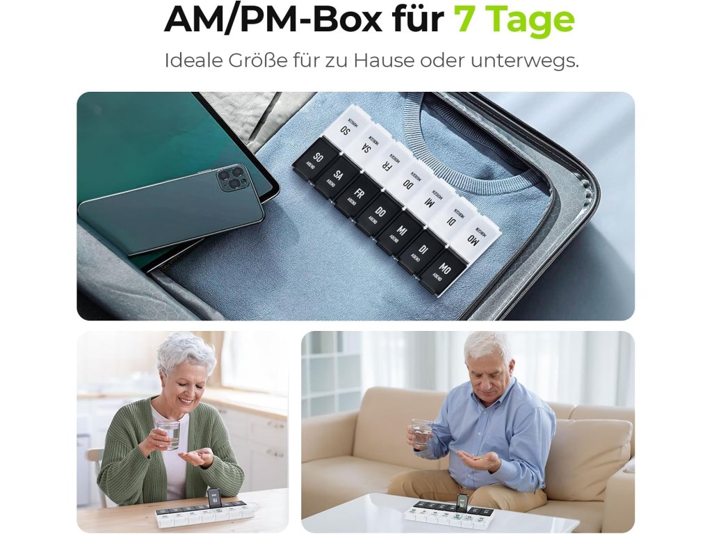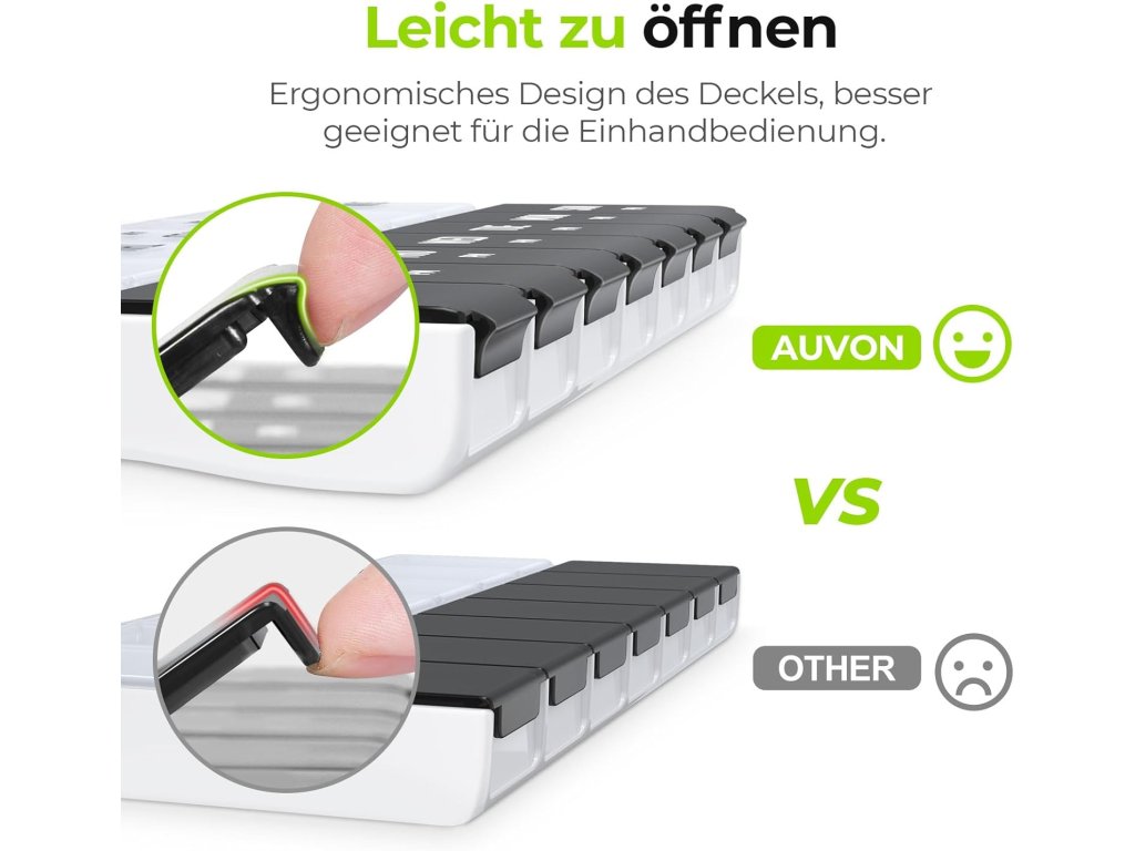 Týdenní dávkovač léků AUVON je praktický organizér s velkou kapacitou, který vám pomůže přehledně si roztřídit léky na celý týden. Každý den má dvě oddělené přihrádky označené barvou a nápisem pro ranní a večerní dávku. Box je vyroben z potravinářského materiálu bez BPA a díky ergonomickému designu víčka je snadné ho otevřít.