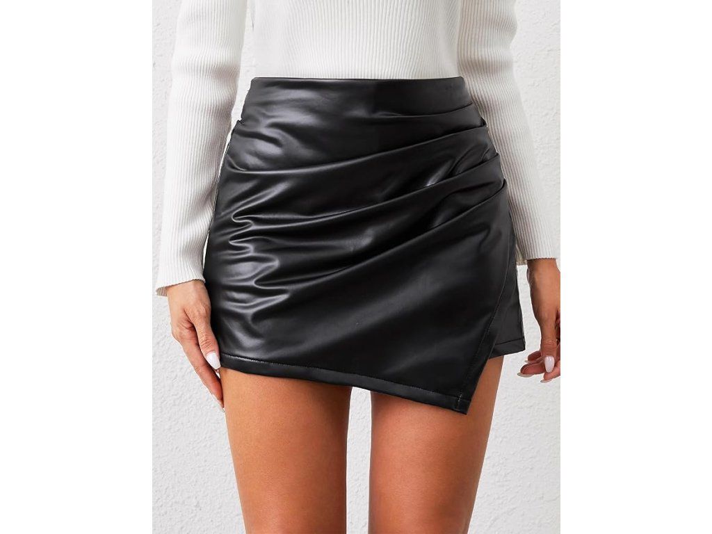 Moderní skort kombinující vzhled elegantní sukně s praktičností kraťasů. Asymetrický střih a koženkový materiál vytvářejí výrazný módní kousek vhodný pro každodenní i společenské outfitové kombinace.