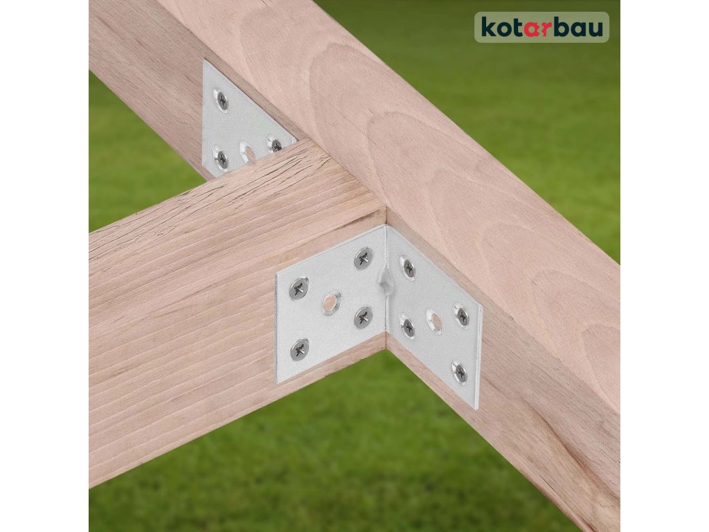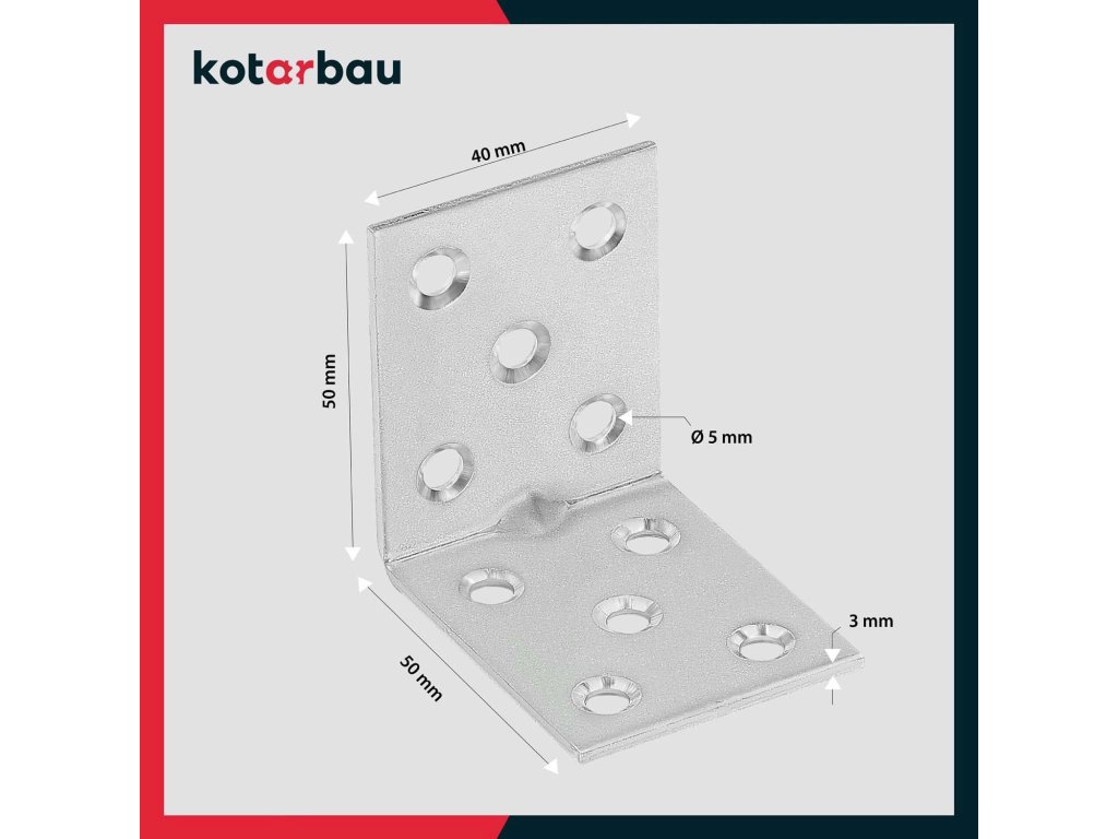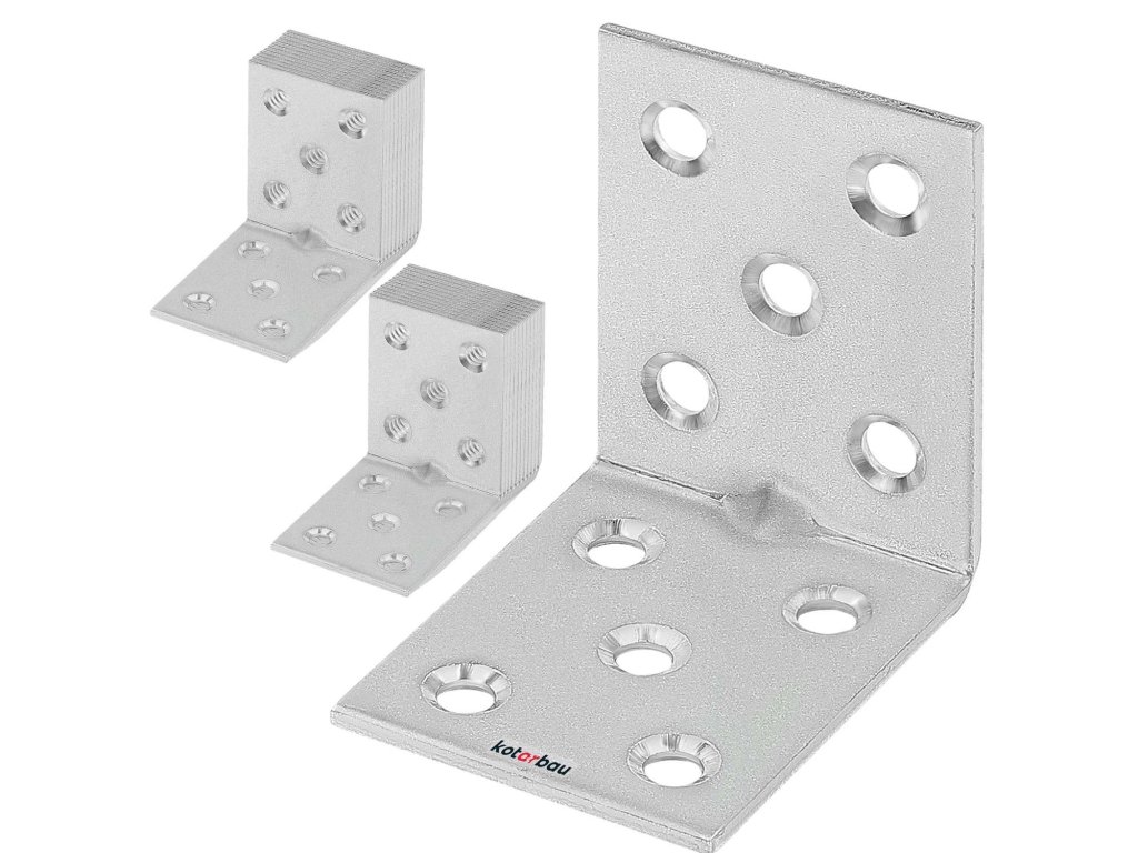 Sada 50 kusů úhelníků s prolisem o rozměrech 50x50x40 mm je vyrobena z pozinkovaného ocelového plechu. Tyto úhelníky nabízejí širokou škálu předvrtaných otvorů, jsou ideální pro pevné a estetické spoje různých konstrukčních prvků, zejména dřeva, a umožňují i kombinaci dřeva s betonem a ocelí.