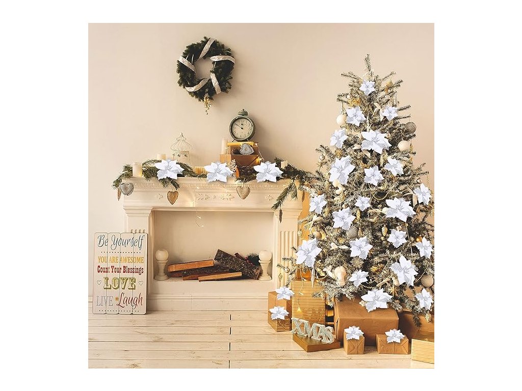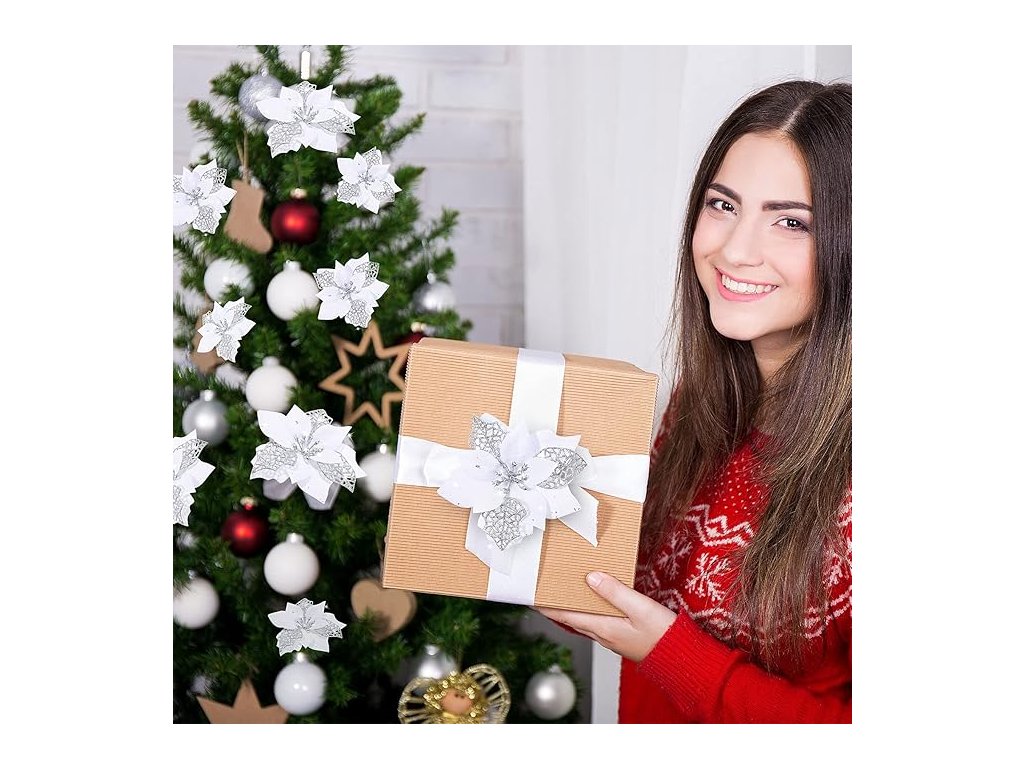 Sada obsahuje 24 kusů umělých vánočních květin typu poinsettia, které jsou rozděleny do tří různých velikostí po osmi kusech. Květiny jsou vyrobeny z kombinace tkaniny a plastu a jsou pokryty třpytivými flitry, které zvyšují atraktivitu vánoční výzdoby a dodávají sváteční atmosféru. Design s dvojitou vrstvou a dutým provedením zajišťuje elegantní vzhled. Dekorace jsou lehké a díky svému tvaru jsou vhodné k připevnění na větve stromku, do girland, na dárky nebo jako součást vánočních aranžmá na stůl. Vzhledem k přepravnímu balení lze případnou deformaci tvaru snadno napravit napařovací žehličkou.