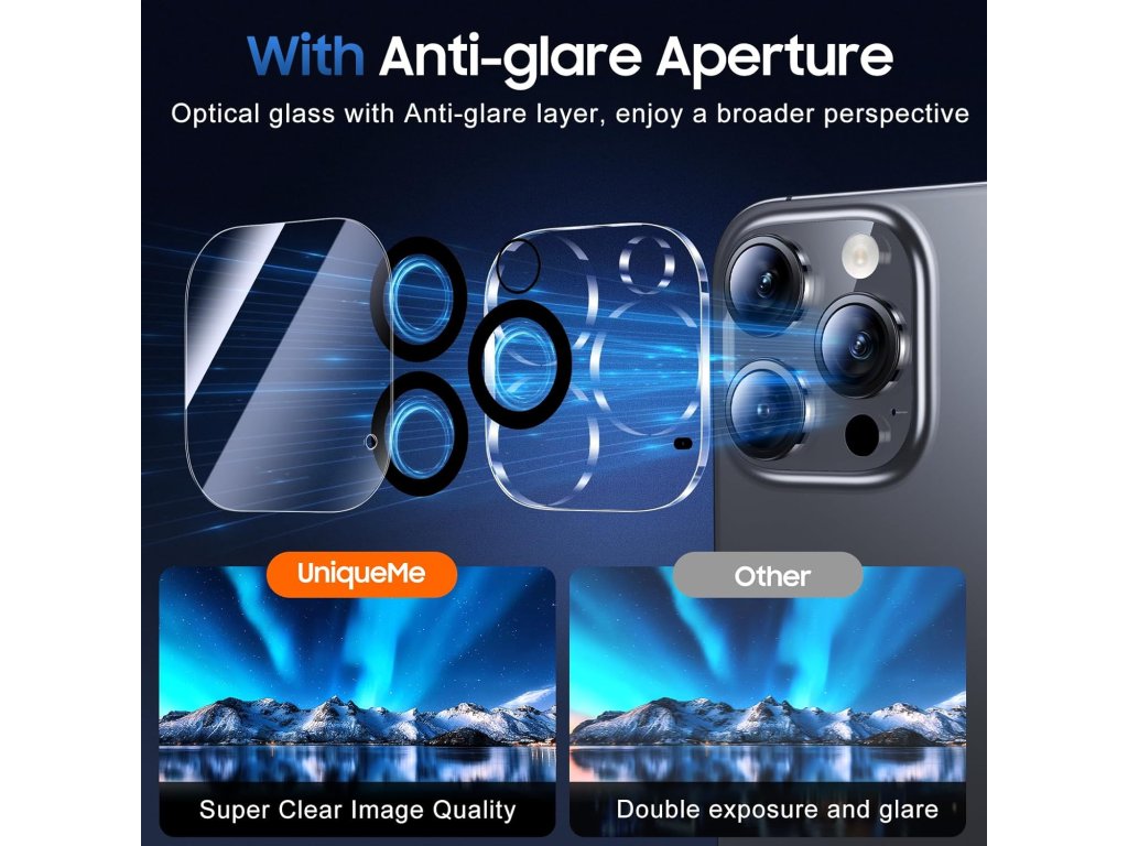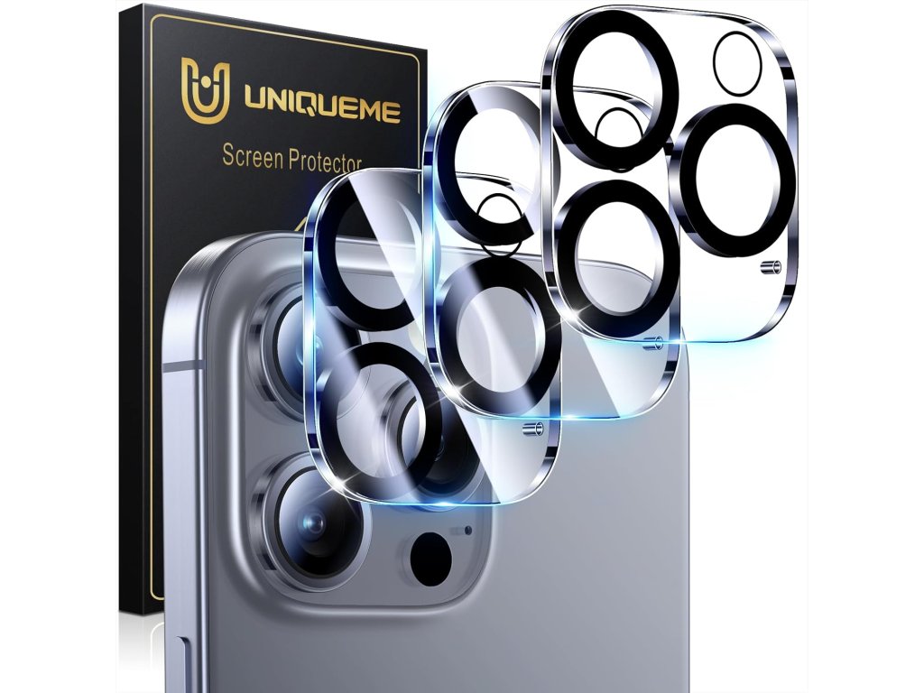 Sada 3 odolných chráničů čoček fotoaparátu UniqueMe pro iPhone 16 Pro / 16 Pro Max z 9H tvrzeného skla s antireflexní vrstvou a oleofobní úpravou. Snadná instalace, kompatibilní s většinou pouzder.