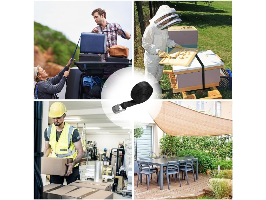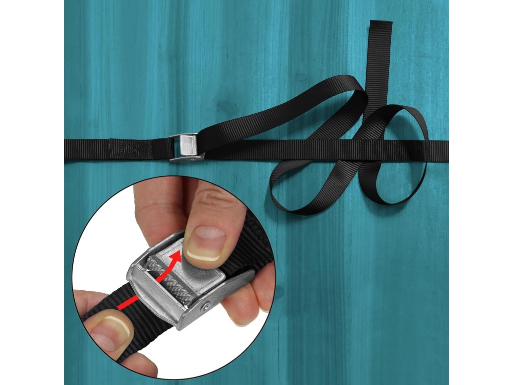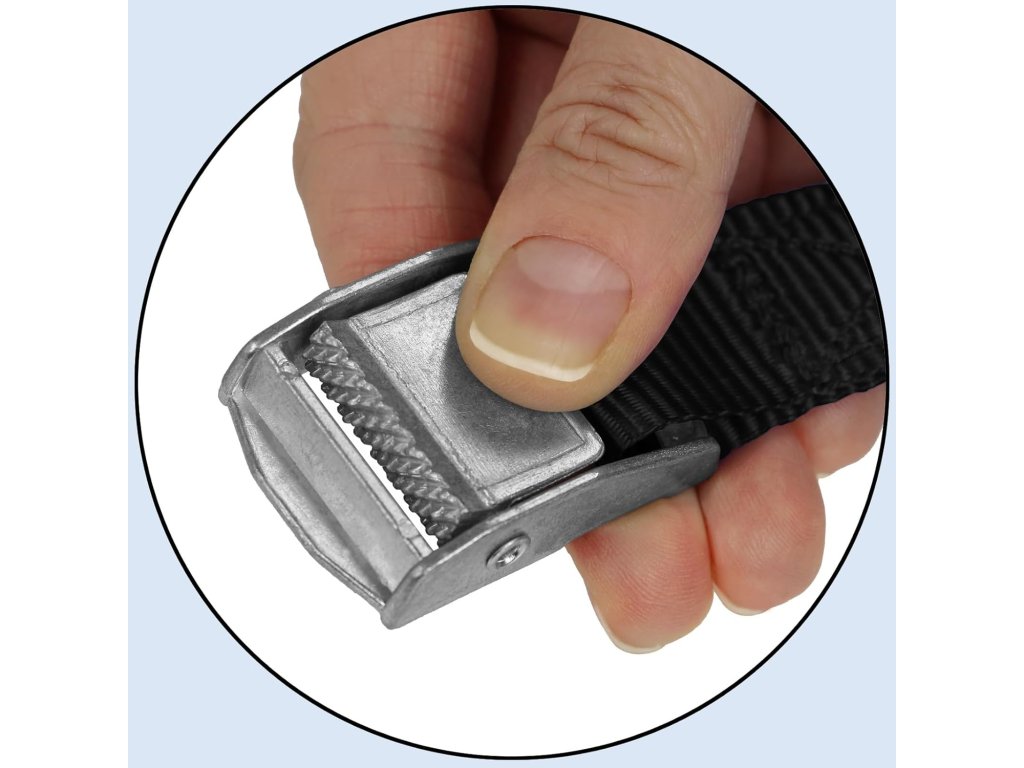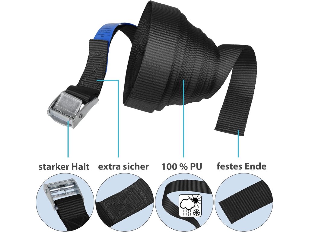 Tato sada obsahuje 4 černé upínací popruhy o délce 2,5 metru a šířce 2,5 cm. Jsou vyrobeny z vysoce pevného polyesteru a vybaveny robustními kovovými přezkami. Každý popruh má nosnost 250 kg a zkušební deska potvrzující shodu s normou DIN EN 12195-2 je umístěna přímo na výrobku. Produkt získal certifikaci "testovaná bezpečnost" od akreditované zkušebny TÜV SÜD Product Service GmbH (číslo certifikátu: Z1A 083173 0013).