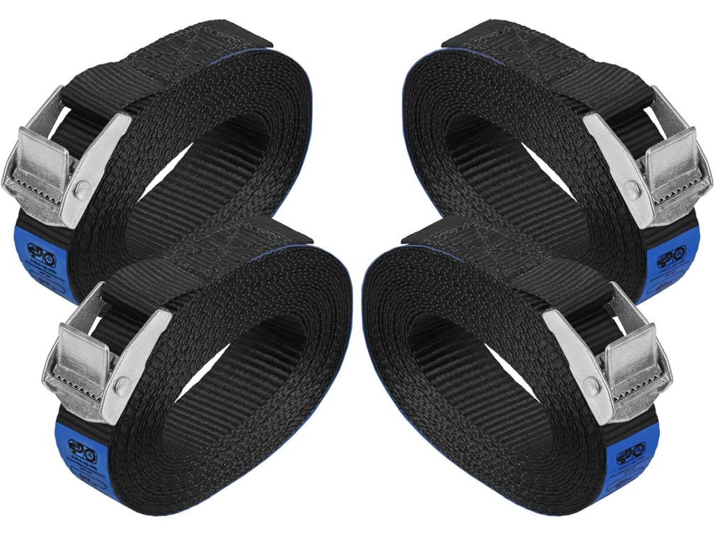Černé upínací popruhy, sada 4 kusů, délka 2,5 m, šířka 2,5 cm, nosnost 250 kg, certifikace DIN EN 12195-2 a TÜV SÜD.