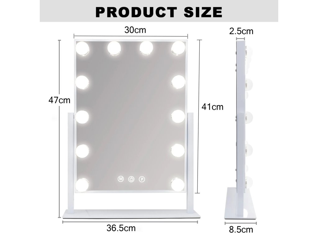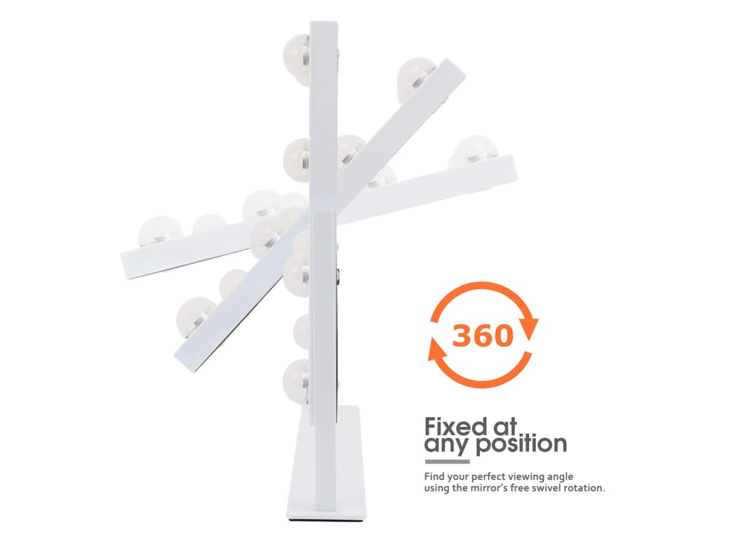 Zrcadlo je vyrobeno z kvalitních materiálů a má stabilní kovový stojan, který zamezuje převrácení. Díky funkci otáčení o 360° si můžete zrcadlo nastavit do libovolného úhlu. Součástí balení je také malé zrcátko s 10násobným zvětšením, které je perfektní pro detailní líčení, úpravu obočí nebo péči o pleť. Ovládání je jednoduché a intuitivní pomocí dotykových senzorů a paměťová funkce si pamatuje poslední nastavení jasu a barvy.