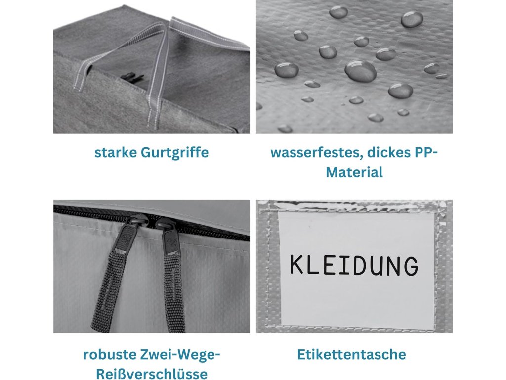 Tyto stěhovací boxy jsou vyrobeny z trvanlivé polypropylenové tkaniny, která je odolná vůči vodě a mechanickému poškození. Konstrukce tašky umožňuje bezpečné přenášení zátěže až 22,7 kg díky dvěma sadám silných popruhových rukojetí. Materiál je navržen pro dlouhou životnost a lze jej v případě potřeby jednoduše očistit vlhkým hadříkem nebo dezinfekčním ubrouskem.