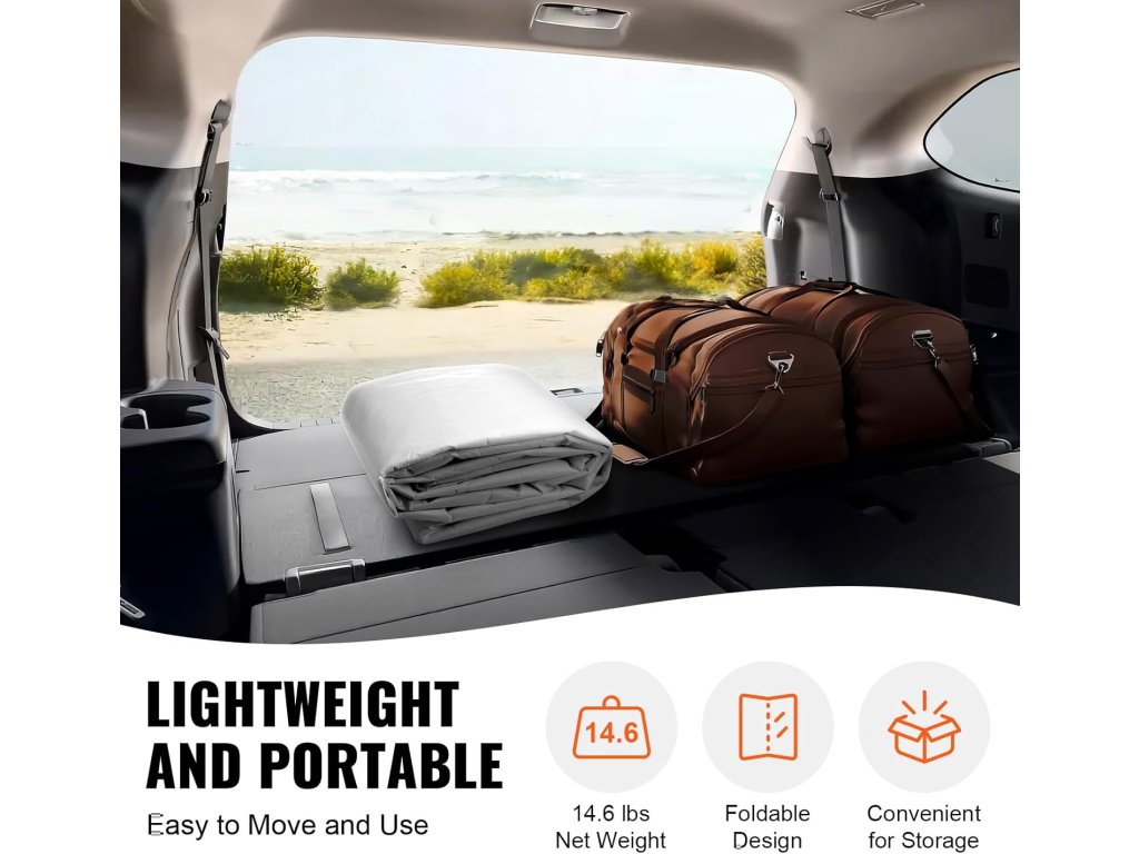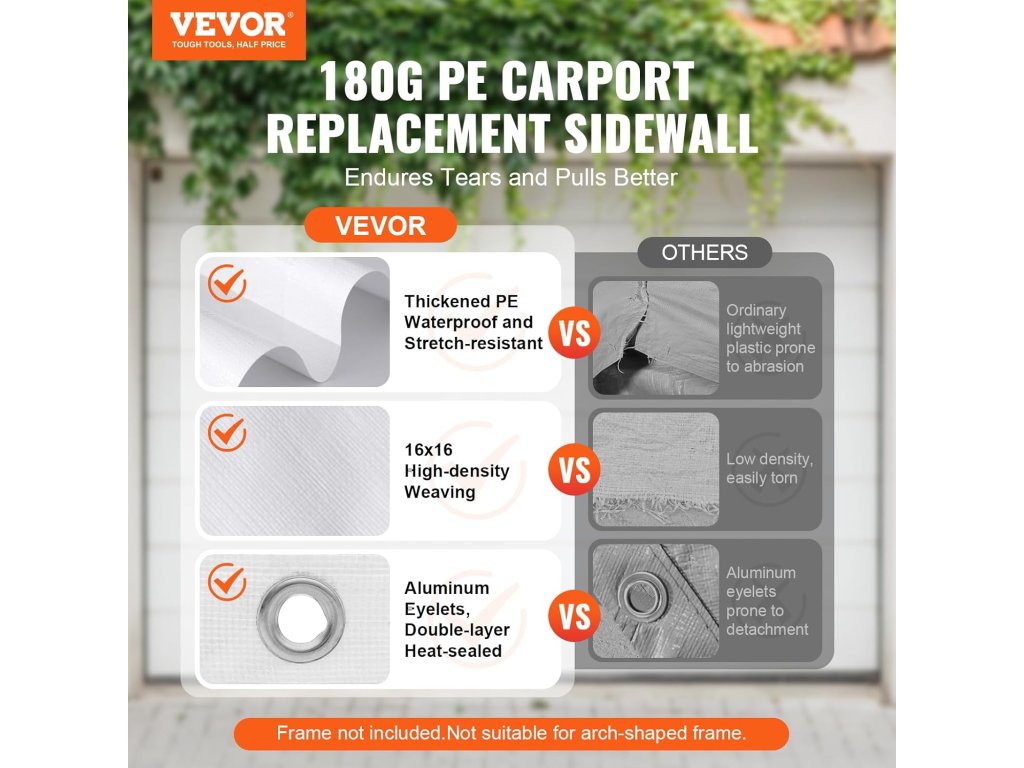 Tato boční stěna od značky VEVOR je ideální pro garážové stany a altány o rozměrech 3 x 6 metrů. Je vyrobena z odolného polyethylenu, který je vodotěsný a odolný vůči UV záření. Díky dvojitým zipům ji můžete snadno použít jako dveře a instalace je rychlá a jednoduchá pomocí přiložených lan. Balení neobsahuje rám ani horní plachtu.