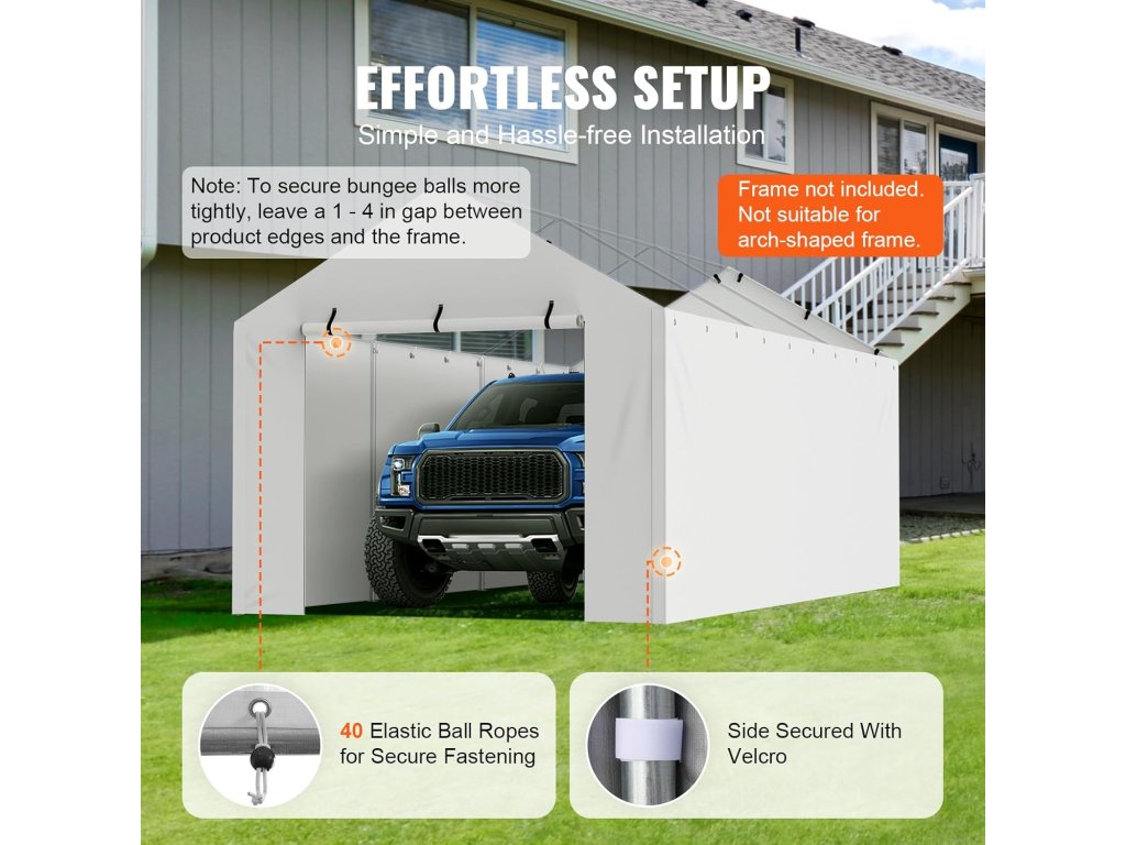 Instalace je velmi snadná a rychlá – jednoduše provlečete přiložené elastické gumičky hliníkovými očky. Díky dvojitým zipům ji můžete použít jako pohodlný vstup. Plachtu můžete využít pro ochranu automobilů, motocyklů, ale také jako provizorní úkryt na oslavy, svatby a další venkovní akce.