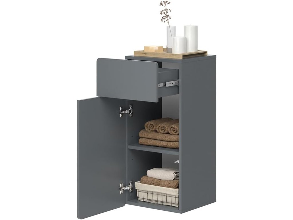 Stylová střední koupelnová skříňka Vicco Izan v šedé barvě nabízí praktické úložné řešení pro vaši koupelnu. Disponuje zásuvkou, otevřenou policí a skříňkou s dvířky, poskytující dostatek prostoru pro všechny vaše koupelnové potřeby. Díky svému univerzálnímu designu se snadno hodí do každé domácnosti. Rozměry skříňky jsou 36,6 cm (šířka) x 76,6 cm (výška) x 32,8 cm (hloubka). Vyrobeno z odolné dřevotřísky. Součástí balení je midi skříňka, montážní návod a potřebný montážní materiál.
