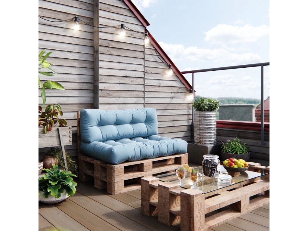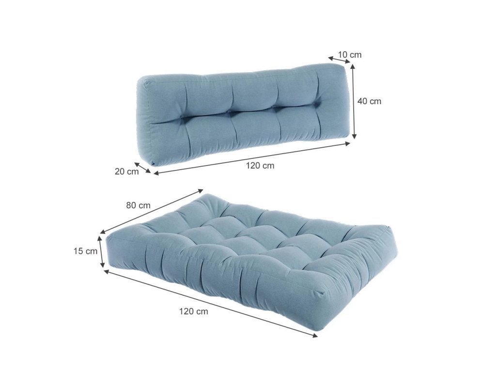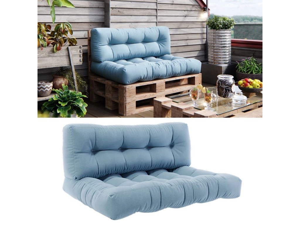 Materiál tvoří vysoce odolný a trvanlivý polyester, který je speciálně určen pro venkovní použití. Polstrování je díky tomu odolné proti opotřebení a snadno se udržuje. Ledově modrý odstín dodá vašemu exteriéru moderní a čistý vzhled. Polštáře můžete využít nejen jako součást paletového nábytku, ale také jako samostatné sedací prvky na podlahu nebo do dětského pokoje.