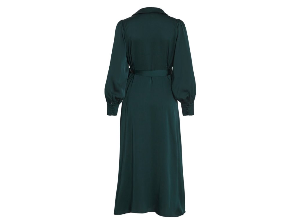 Produkt od značky VILA představuje klasické midi šaty vyrobené z elegantní, nepružné saténové látky, která dodává oděvu jemný lesk a luxusní vzhled. Šaty mají zavinovací střih s překříženým výstřihem do V, který doplňují stylová nabíraná ramena a objemnější rukávy zakončené manžetami se třemi knoflíky. Tento design kombinuje prvky moderní módy s klasickou elegancí, což z nich činí velmi univerzální kousek.
