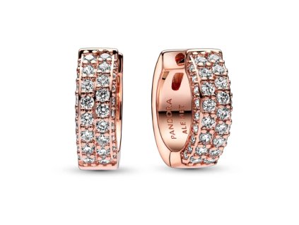 Kruhové náušnice Pandora jsou ručně dokončované a pozlacené 14karátovým růžovým zlatem. Jsou osázené kubickými zirkoniemi, které vytváří třpytivý efekt.