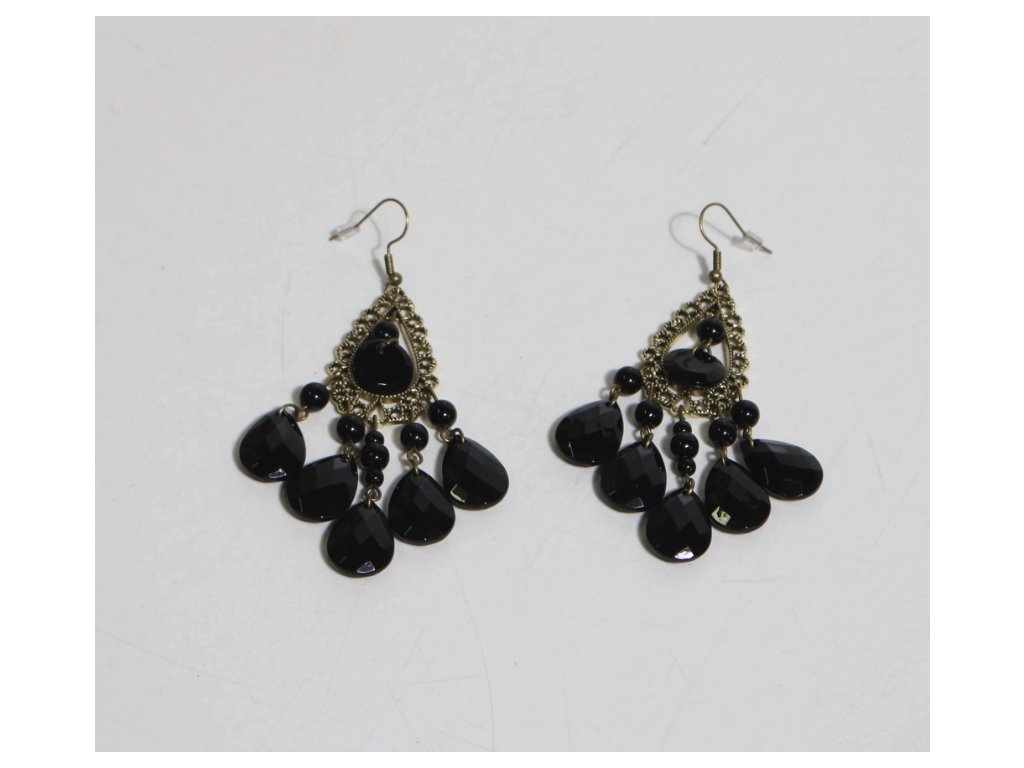 Tyto vintage náušnice mají design inspirovaný krajkou a jsou zdobené černými korálky a krystaly ve tvaru slzy. Jsou vyrobené ze zinkové slitiny.