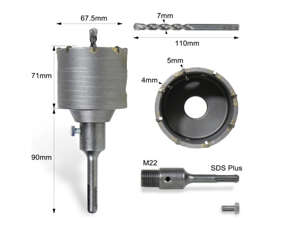 Součástí sady je středicí vrták o rozměrech 8 x 110 mm vyrobený ze slitin YG8 a YG11, které se vyznačují mimořádnou tvrdostí a odolností proti korozi. Adaptér se systémem SDS plus umožňuje rychlé a bezpečné uchycení do běžných vrtacích kladiv. Každá korunka je dodávána v samostatném plastovém boxu a je ošetřena olejem, který chrání kovové části před vznikem rzi během skladování. Díky preciznímu zpracování poskytuje nástroj vysokou přesnost a stabilitu při vrtání.