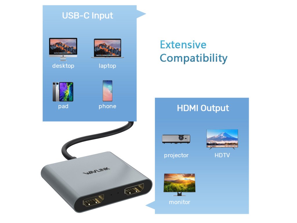 Adaptér WL-UH510 umožňuje připojit až dva externí HDMI monitory k vašemu zařízení s USB-C portem.
