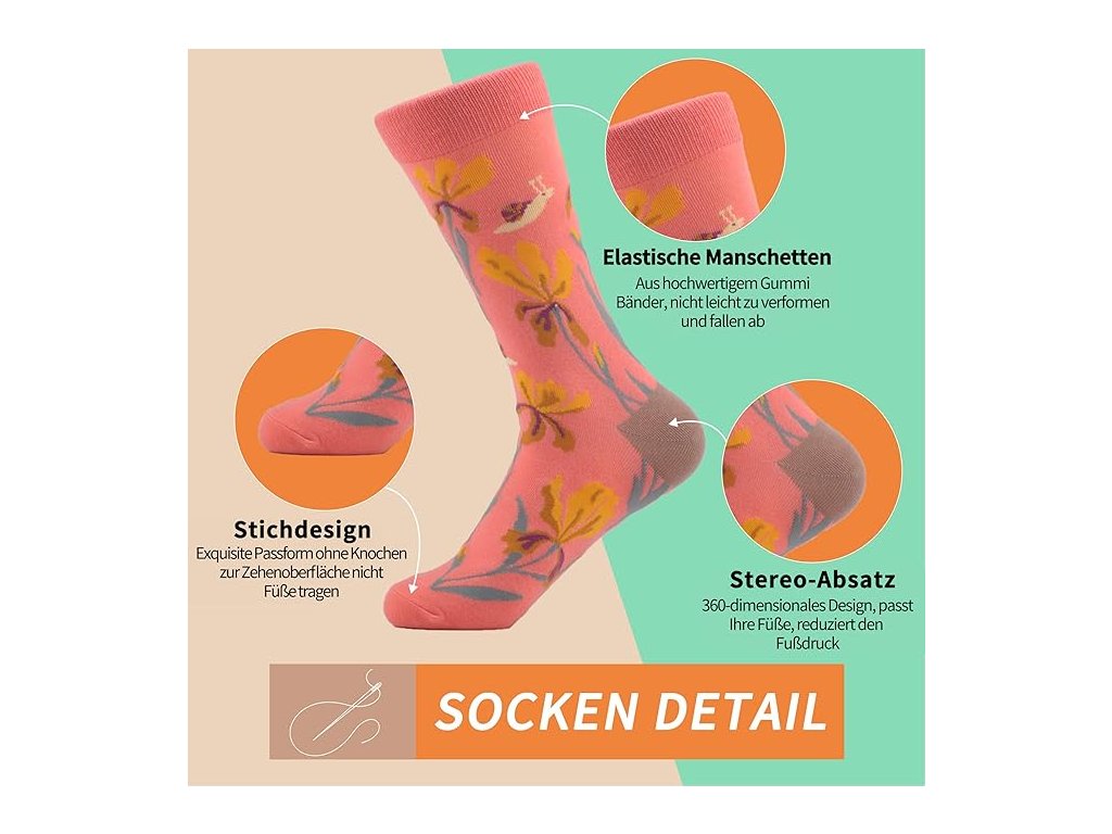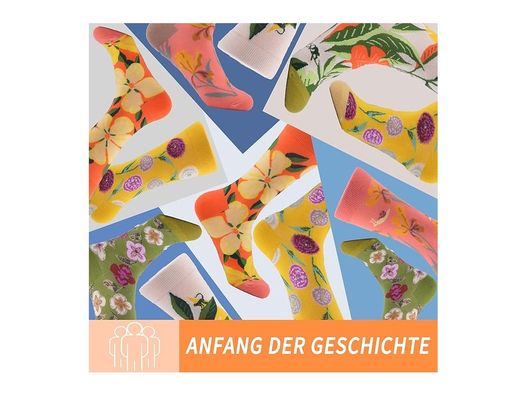 Produkt značky WeciBor je určen pro ženy, které chtějí oživit svůj outfit originálními doplňky. Sada obsahuje pět párů ponožek zdobených motivy orchidejí, karafiátů a další zeleně v zářivých barvách. Díky technice tkaní jacquard jsou vzory detailní a barvy zůstávají syté. Hlavní složkou materiálu je z 80 % kvalitní česaná bavlna, doplněná nylonem a elastanem pro optimální pružnost a odolnost proti opotřebení.