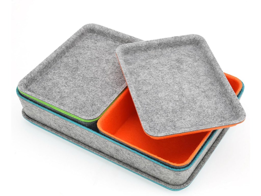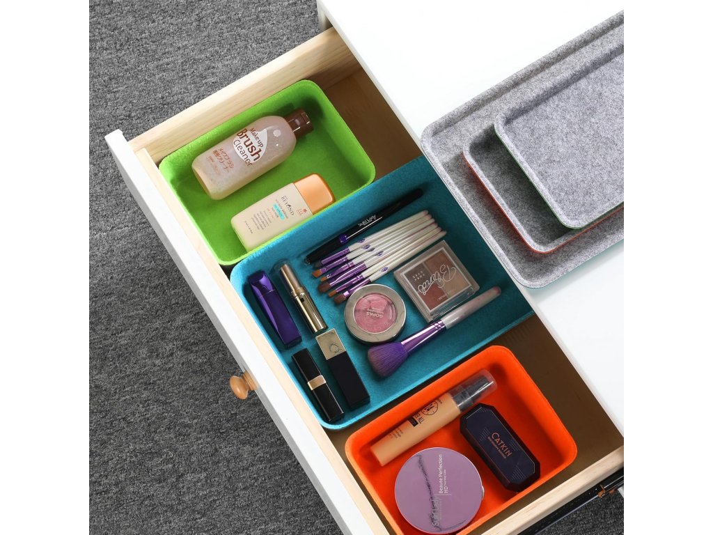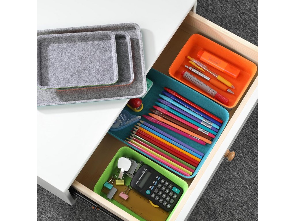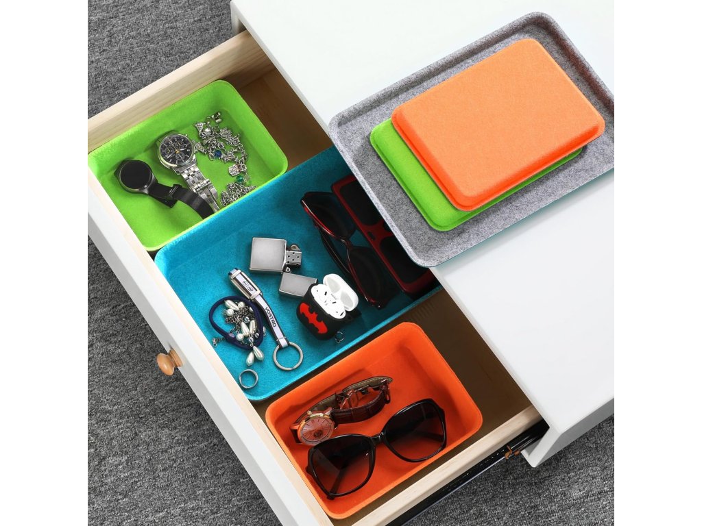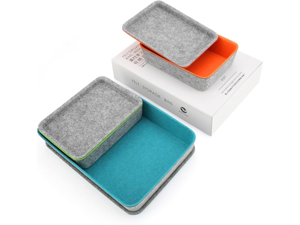 Sada 3 stohovatelných plstěných úložných boxů Welaxy s víky v moderním dvoubarevném provedení (šedá vně, oranžová, zelená a tyrkysová uvnitř). Obsahuje 1 větší box (26,9 x 19,1 x 4,6 cm) a 2 menší boxy s víky (18 x 13 x 4,6 cm). Ideální pro organizaci domácí kanceláře, pracovního stolu, nočního stolku či předsíně. Vhodné pro uložení make-upu, kancelářských potřeb, klíčů, telefonu, peněženky, hodinek, brýlí a dalších drobností. Vyrobeno z recyklované plsti, která je příjemná na dotek, tichá a chrání uložené předměty před poškrábáním. Snadné čištění vlhkým hadříkem. Dodají vašemu prostoru elegantní a minimalistický vzhled.
