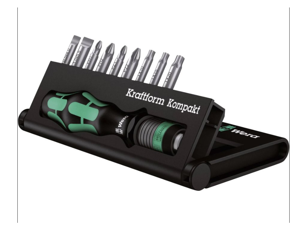 Obsah sady Sada obsahuje 10 dílů: Ruční držák Kraftform 813 R: 6,3 (1/4") x 90 mm s rychlovýměnným sklíčidlem Rapidaptor. Rukojeť je vícekomponentní pro vysoké pracovní rychlosti a ergonomické šroubování. 9 bitů – 25 mm dlouhé: 1 plochý bit: 0,5 x 4,0 mm a 1,0 x 5,5 mm Křížový bit PH: PH 1, PH 2 Křížový bit PZ: PZ 1, PZ 2 TORX: T10, T15, T20