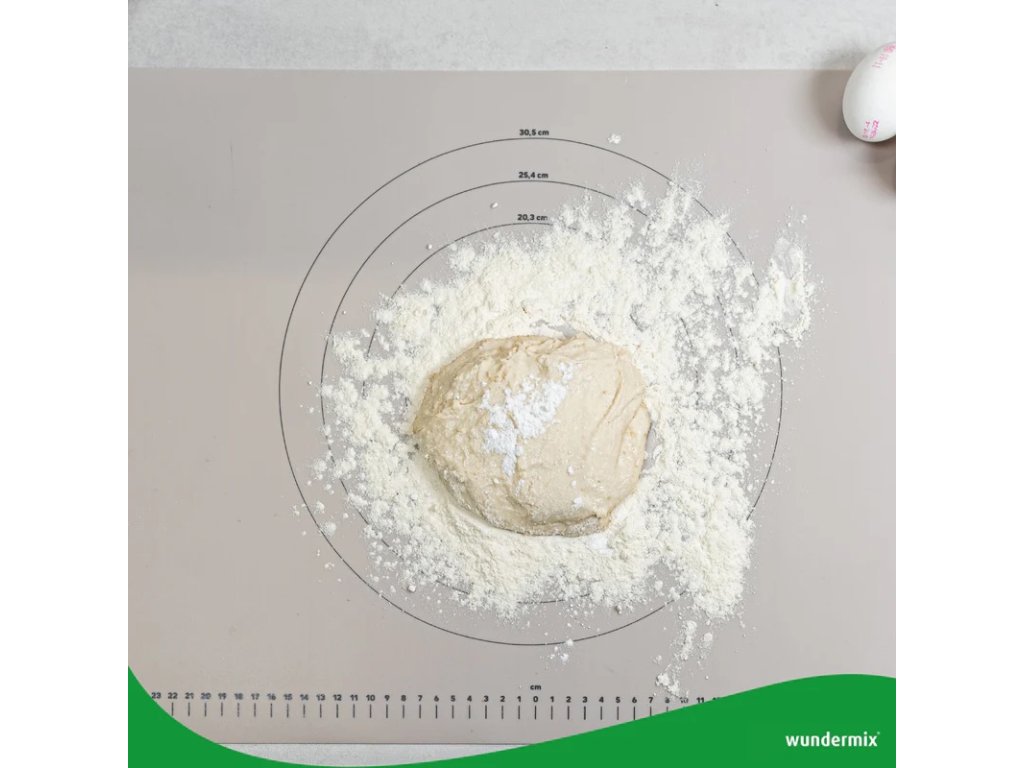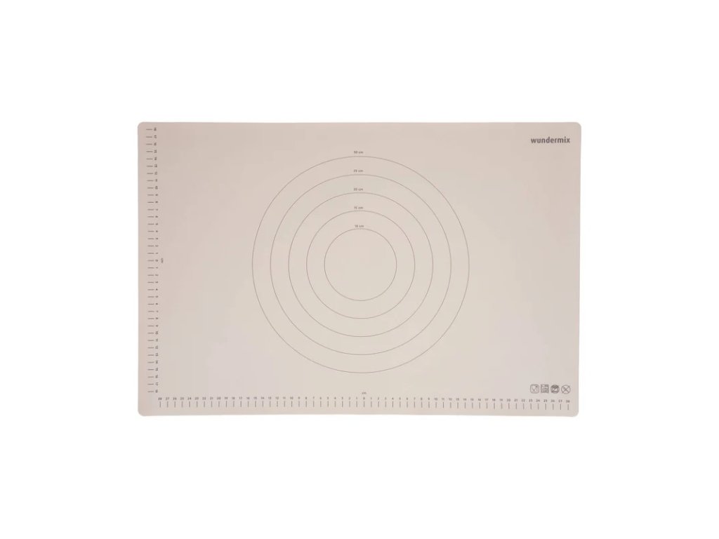 Wundermix WunderMat je prémiová silikonová podložka na těsto o rozměrech 60 cm x 40 cm. Je ideální pro hnětení a válení těsta díky protiskluzové úpravě na zadní straně a nepřilnavému povrchu na straně pracovní. Obsahuje vyznačené pomocné značky pro kruhové formy a centimetrové měřítko pro zajištění přesných výsledků při pečení. Je certifikována pro styk s potravinami bez BPA a lze ji mýt v myčce nádobí.