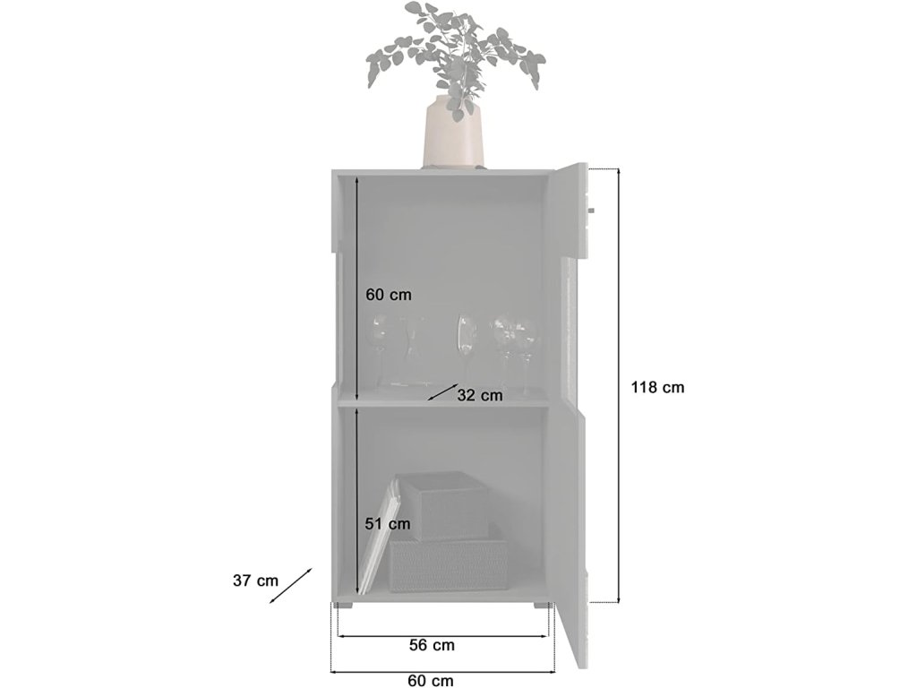 Moderní a praktická skleněná vitrína Xonox.home Freno v šedé barvě s kontrastními prvky v dekoru dub Nox. Tato vitrína o rozměrech cca 60 x 118 x 37 cm nabízí elegantní úložný prostor s jedněmi skleněnými dvířky a jednou vnitřní policí. Je ideální pro vystavení dekorací, skla nebo knih. Nadčasový design a kvalitní materiály zaručují dlouhou životnost a snadnou údržbu. Jako součást modulárního systému Xonox.home ji lze snadno kombinovat s dalším nábytkem ze stejné série. Produkt s certifikací FSC podporuje zodpovědné lesní hospodářství a splňuje bezpečnostní normy. Dodáváno v demontovaném stavu, bez dekorací.