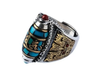 Tento prsten je vyroben z mědi a má motiv rotujících devítiokých nebeských korálků a šestipostarové mantry. Je nastavitelný a má zlatou a stříbrnou barvu.