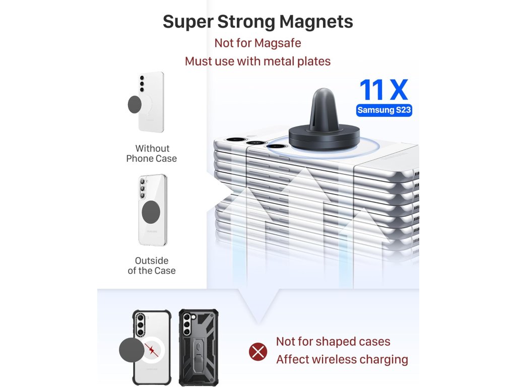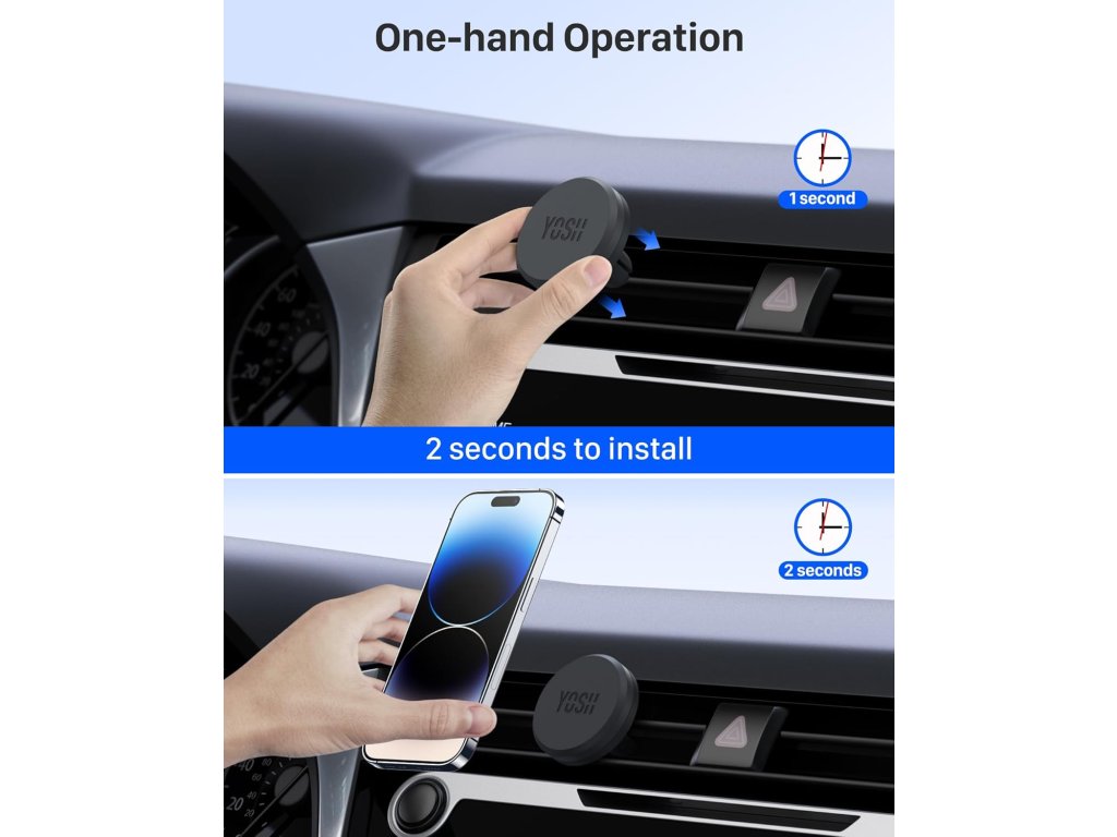 Ultra kompaktní magnetický držák telefonu do auta YOSH je ideálním řešením pro bezpečné a pohodlné používání mobilního telefonu během jízdy. Upevňuje se na horizontální větrací mřížku vašeho automobilu (kompatibilní s Ford, BMW, Nissan, Vauxhall, Audi a dalšími). Držák využívá silné magnety, které spolehlivě udrží váš telefon i na nerovných cestách. Měkká guma (silikon 50D) chrání jak ventilaci, tak váš telefon před poškrábáním a deformací způsobenou teplem. Ovládání jednou rukou umožňuje snadné připevnění i odejmutí telefonu a nastavení ideálního pozorovacího úhlu. Díky malým rozměrům (40 mm) je držák nenápadný, když se nepoužívá, a neblokuje výhled.