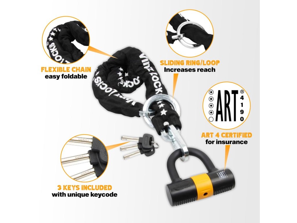 Zámek VINZ Trivor ze série Trivor je robustní řetězový zámek s certifikací ART 4, určený pro zajištění dvoukolových vozidel, člunů a motorů.