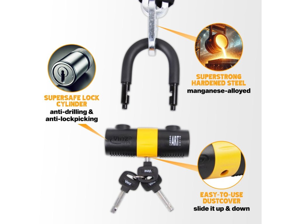 Série Trivor od VINZ je známá svou pevností a flexibilitou. Tento zámek je opatřen masivním a těžkým řetězem z tvrzené oceli, jehož tloušťka článku je 10,5 mm a celková tloušťka 42 mm. Na konci řetězu se nachází ocelová smyčka, která umožňuje efektivně využít celou délku řetězu, například pro připevnění vozidla k pevnému bodu, jako je sloup osvětlení nebo kotva na stěnu.