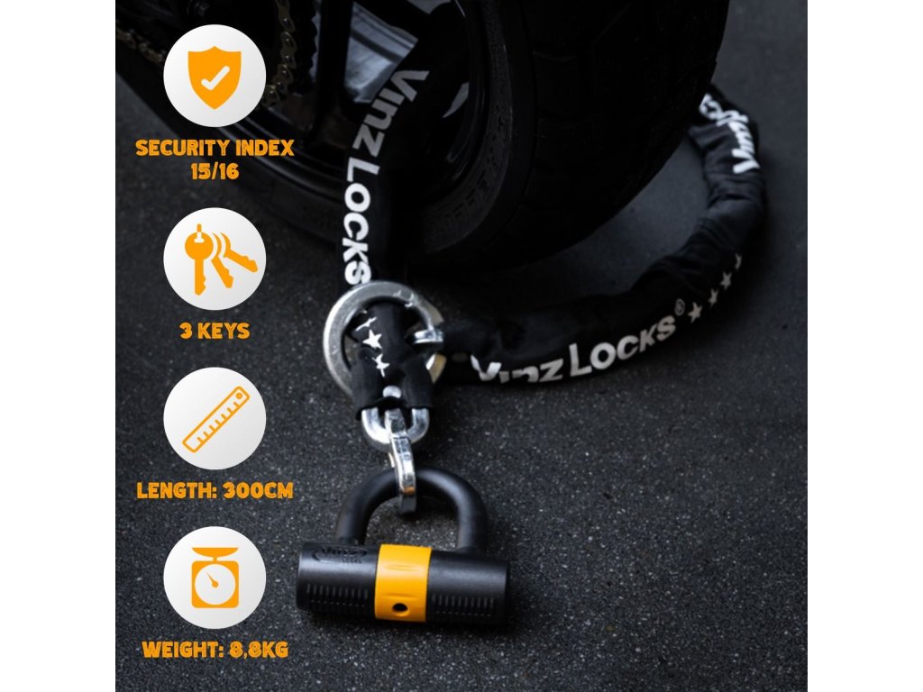 Chraňte své cennosti s maximální jistotou díky zámku VINZ Trivor. Tento robustní a všestranný řetězový zámek je navržen tak, aby poskytoval velmi vysokou úroveň zabezpečení pro vaše dvoukolová vozidla, čluny nebo motory.
