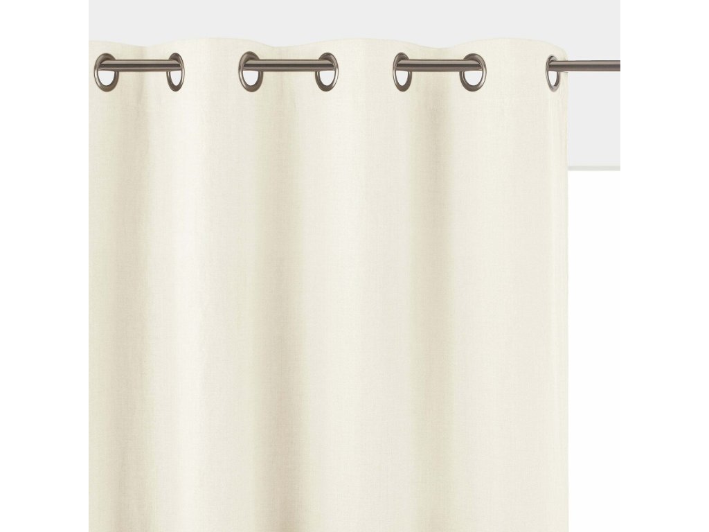 Závěs je vybaven očky v tmavě šedé barvě o vnitřním průměru 4 cm. Tato očka zajišťují, že látka padá do krásných, pravidelných vln a elegantně klouže po záclonové tyči, což usnadňuje otevírání a zavírání závěsu. Spodní část závěsu je zakončena hladkým lemovaným lemem, což přispívá k celkovému čistému a dokončenému vzhledu.