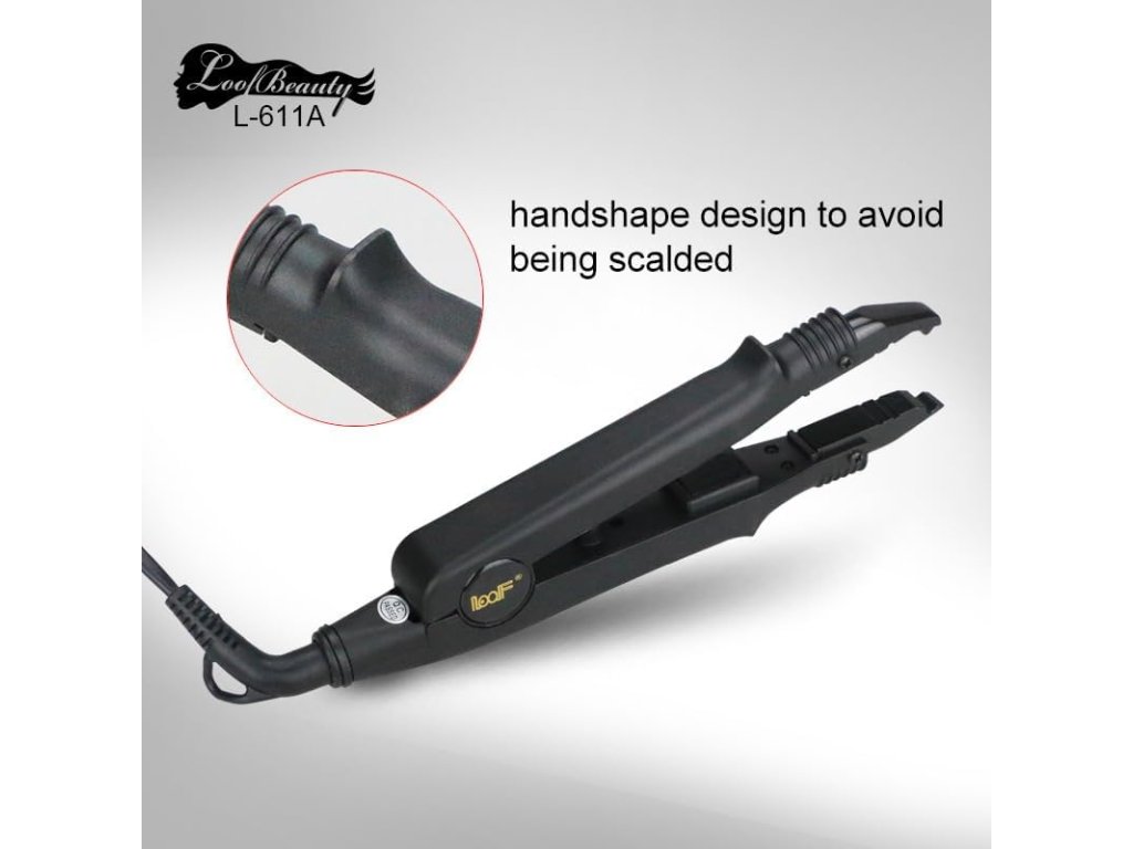 Profesionální žehlička na prodlužování vlasů Loof Style02 v černé barvě. Salonní model s bleskově rychlým nahříváním a konzistentním dodáváním tepla. Disponuje malými drážkami vhodnými pro všechny typy vyhřívaných systémů prodlužování vlasů. Extra dlouhý (2,5 metru) a otočný o 360° kabel zajišťuje pohodlnou manipulaci. Elegantní a lehká konstrukce.
