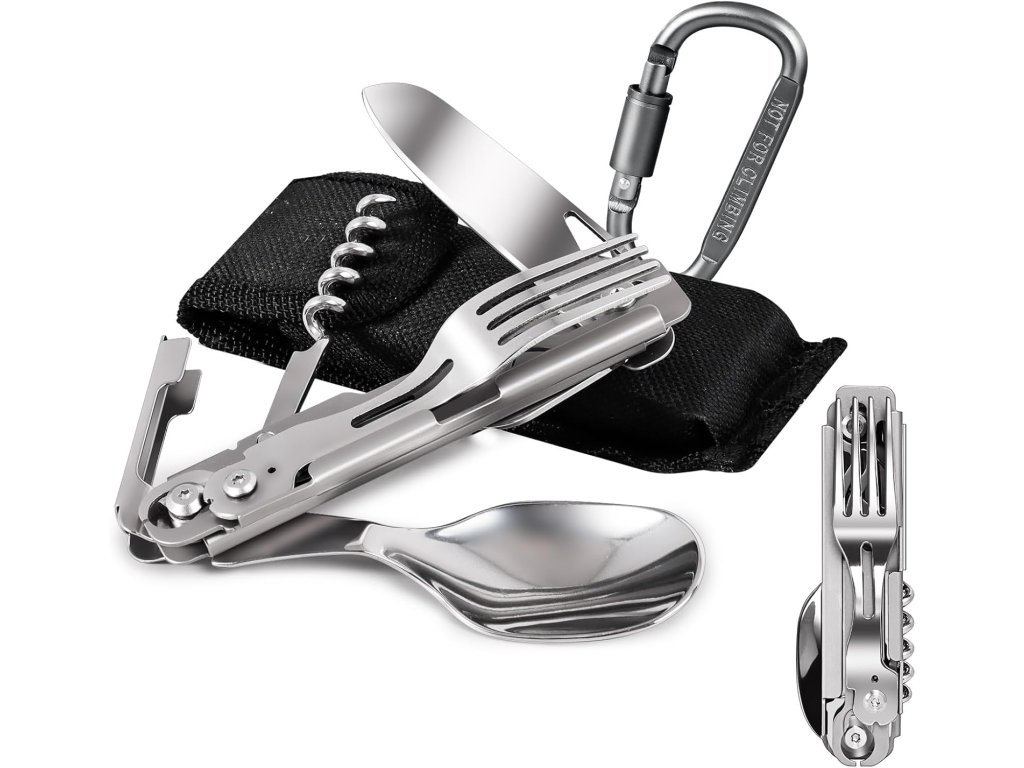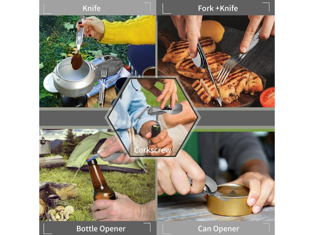 - Ideální kempingová sada: Součástí balení je 8 kusů vybavení: 1 skládací nůž, 1 vidlička, 1 lžíce, 1 otvírák na láhve, 1 vývrtka, 1 kroužek na klíče, 1 nylonová cestovní taška. Jste připraveni k okamžitému odjezdu!