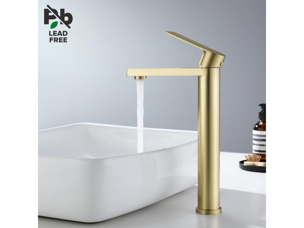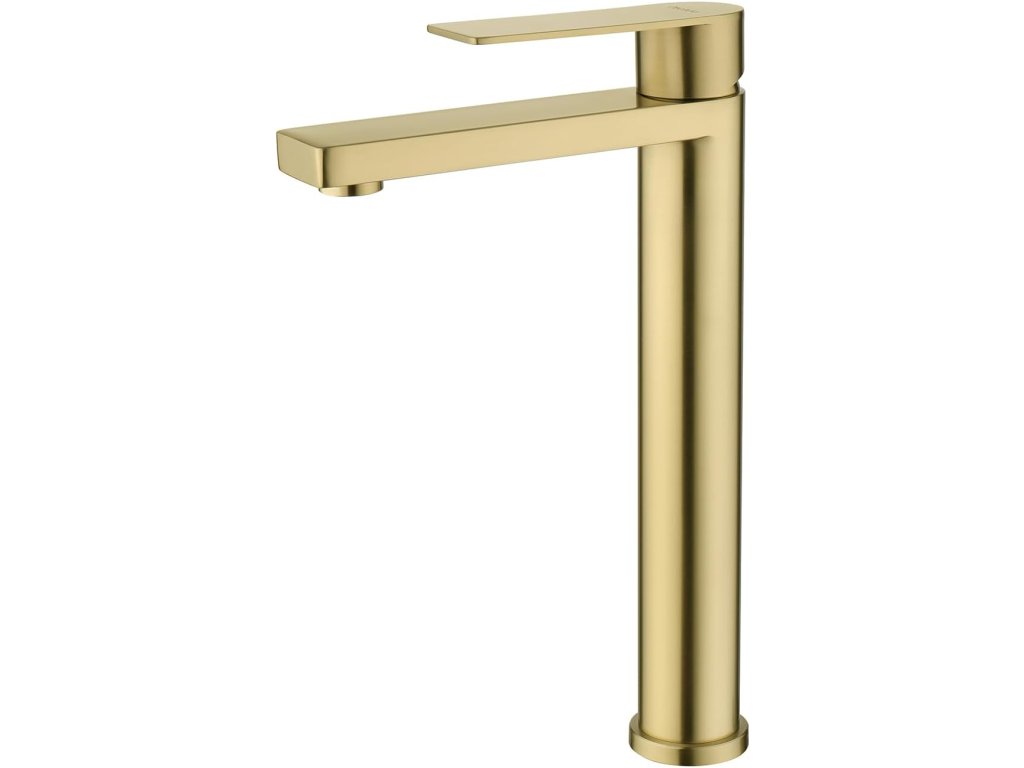 Zlatá vysoká umyvadlová baterie Decaura z nerezové oceli, jedno-páková, pro umyvadla bez otvoru.