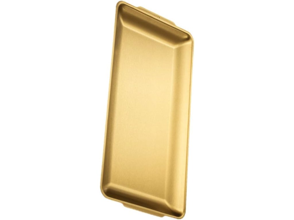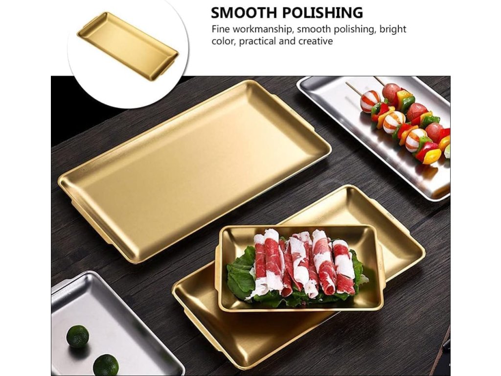 Vysoce kvalitní zlatý servírovací tác z nerezové oceli (11 × 22 palců). Odolný, nedeformovatelný, nerezavějící, vodotěsný a snadno se čistí.