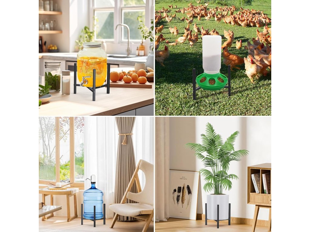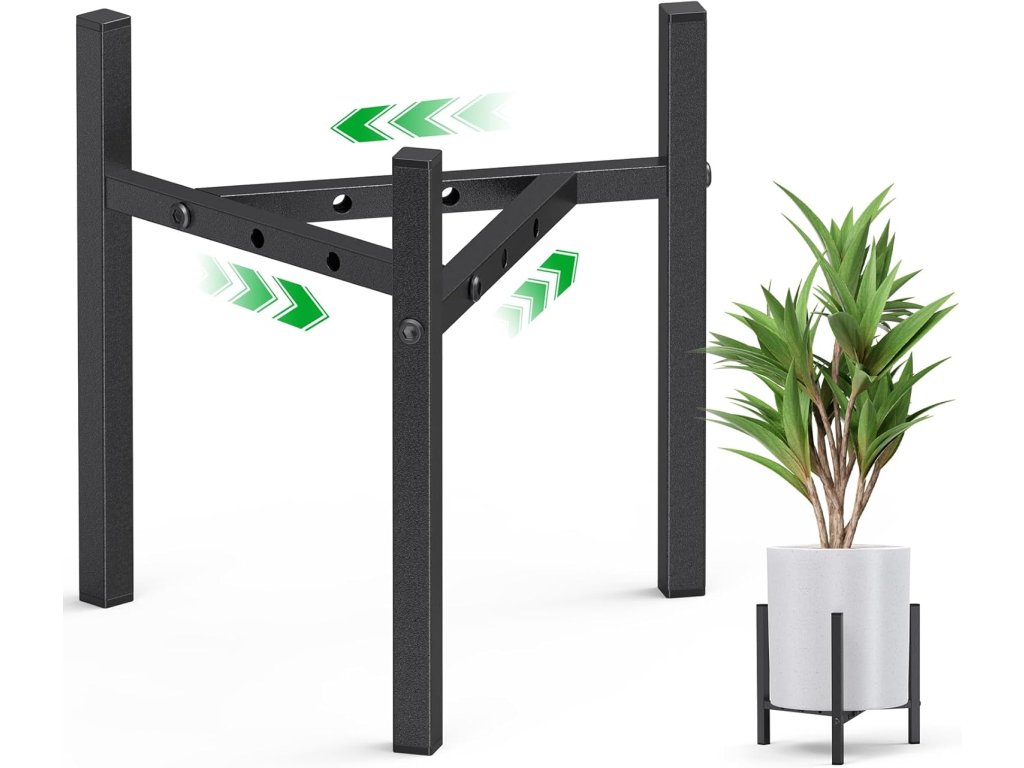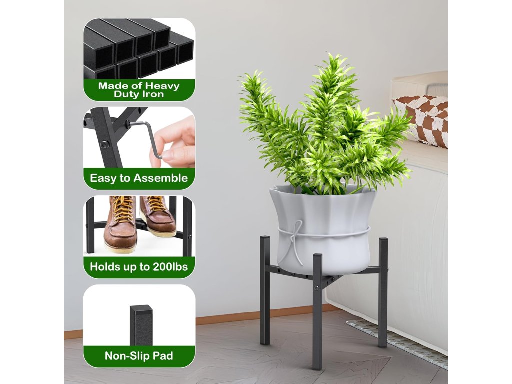 Konstrukce je vyrobena z vysoce kvalitního kovu s práškovým nástřikem, který zajišťuje odolnost proti rzi a dlouhou životnost. Montáž je velmi intuitivní a rychlá; stačí vložit příčnou tyč do zářezu a zajistit pomocí šroubů. Minimalistický černý design skvěle doplňuje moderní interiéry i exteriéry a poskytuje stabilní základnu pro vaši zeleň. Stojan pomáhá efektivně využít prostor v rozích místností, na chodbách nebo terasách.