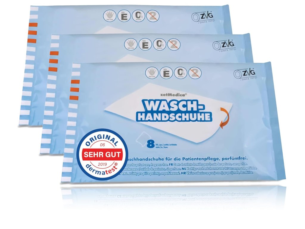 ZVG vlhčené mycí rukavice v balení po 24 kusech jsou připravené k okamžitému použití a nevyžadují oplachování. Jsou velké, měkké, odolné proti roztržení, pH neutrální, bez parfemace a 0% alkoholu. Lze je ohřát v mikrovlnné troubě. Ideální pro hygienu ležících pacientů, kempování, festivaly nebo turistiku, splňují nejvyšší EU standardy kvality.